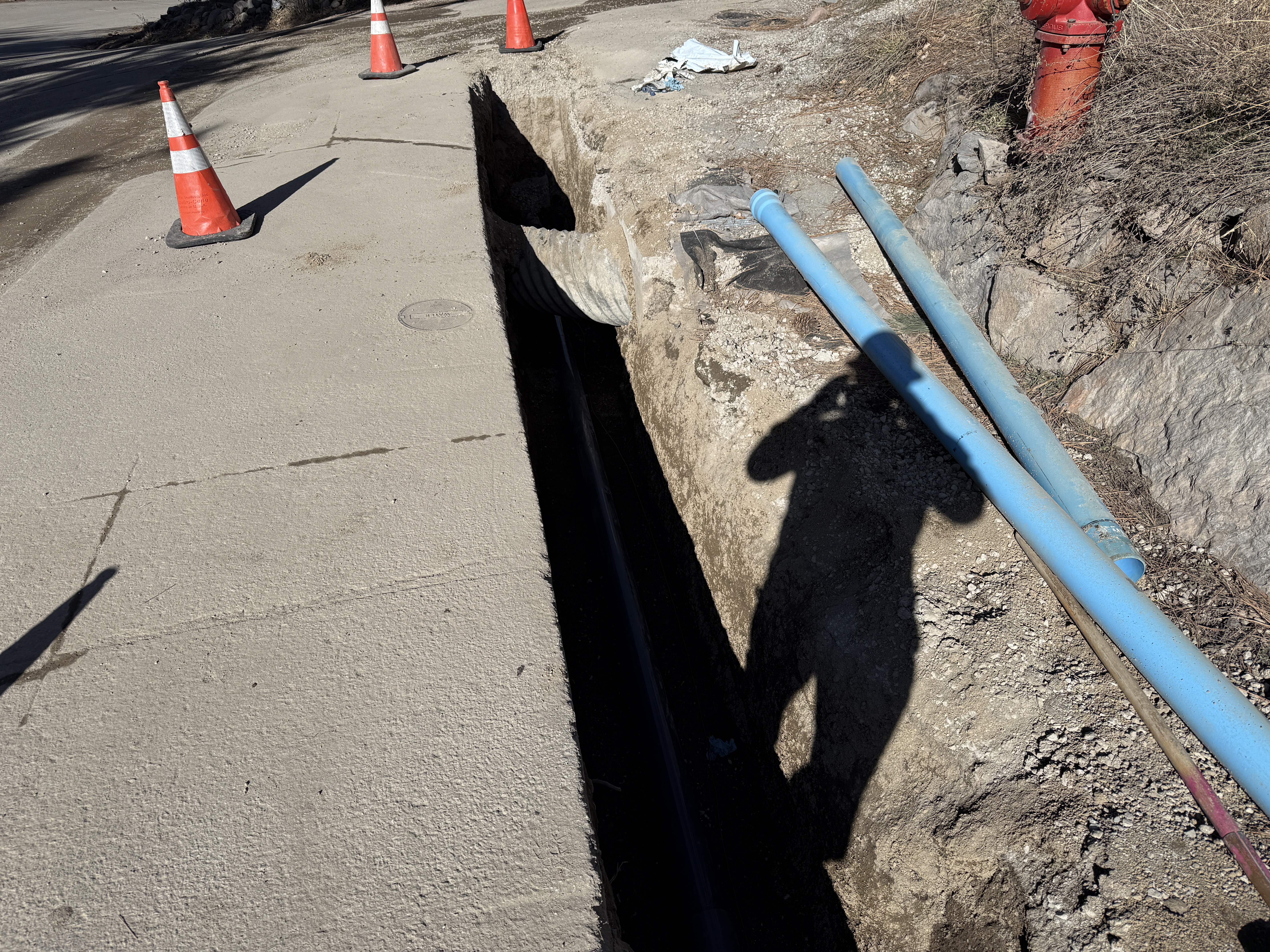 The image depicts an open trench along a paved sidewalk. Several orange safety cones are placed near the edge for visibility. Two long blue pipes are positioned on the ground beside the trench. A nearby fire hydrant is visible on the right, indicating proximity to utility systems.