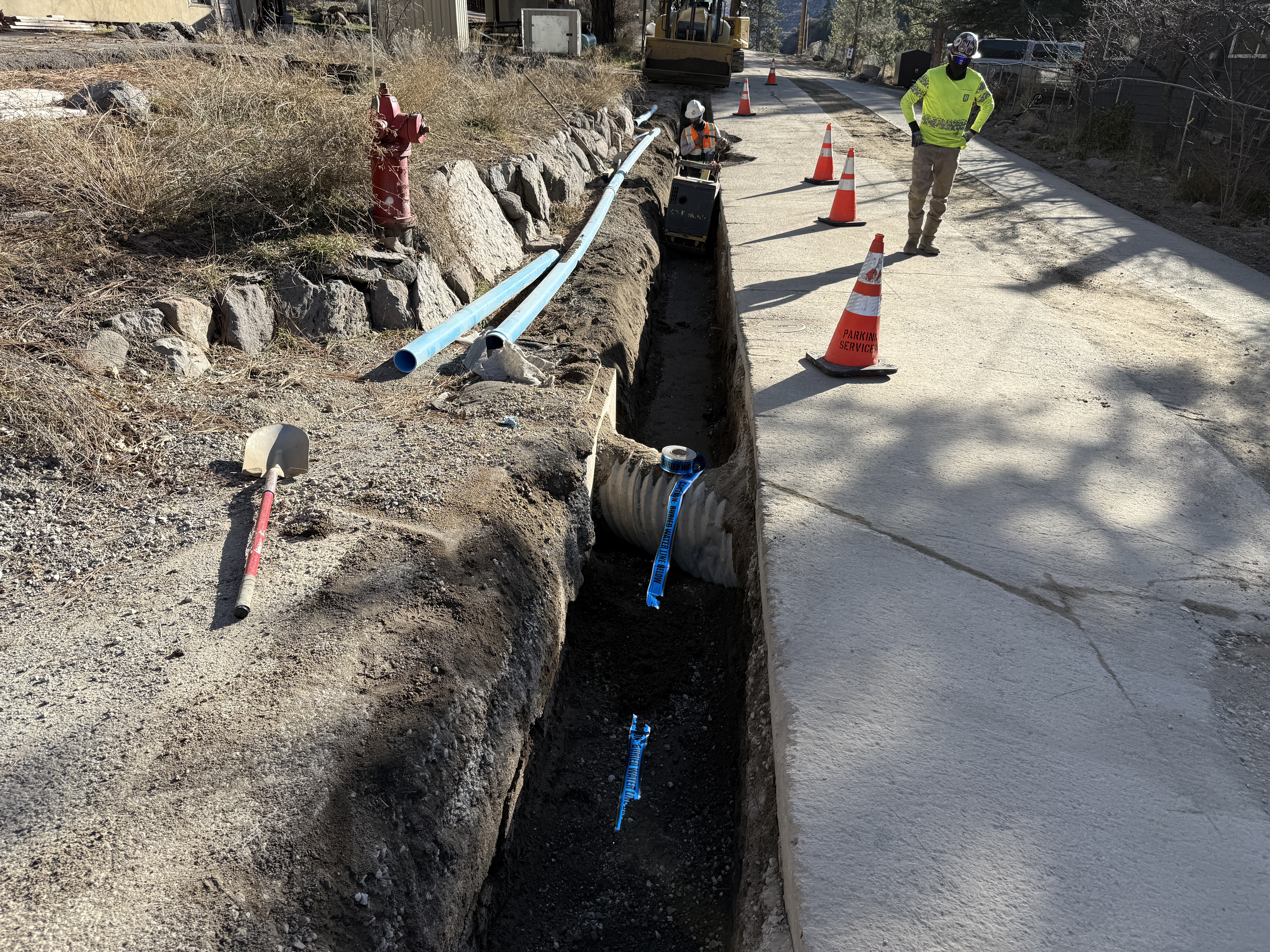 The image shows a trench excavated along a roadway with workers present. Blue pipes are laid alongside the trench, and there's an open trench barricaded with cones. A shovel is seen in the dirt close to the trench. One worker is operating a small piece of equipment inside the trench and another stands nearby.