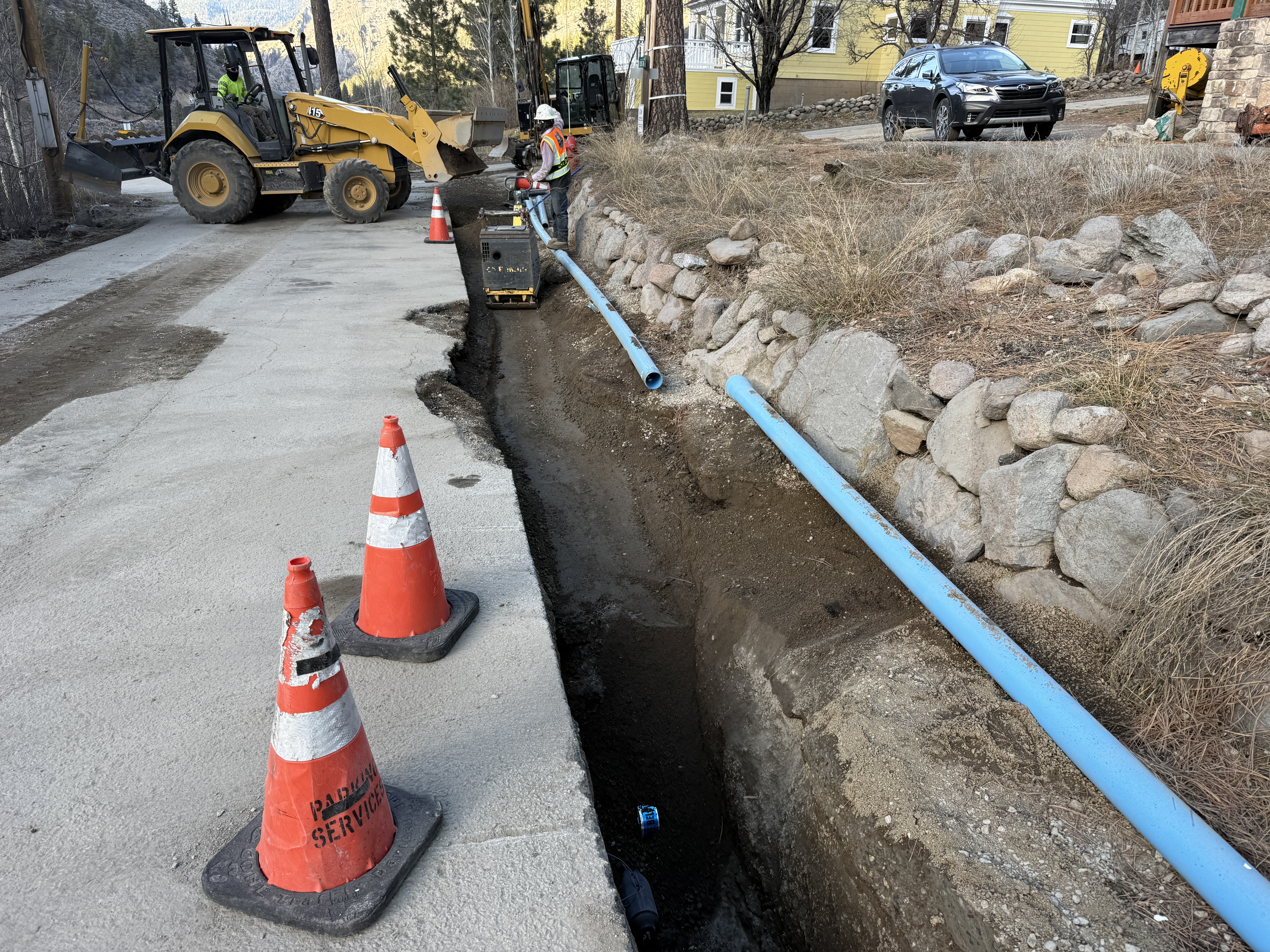 exposed soil in trench, paved road surface clear daytime lighting access appears partially restricted by cones