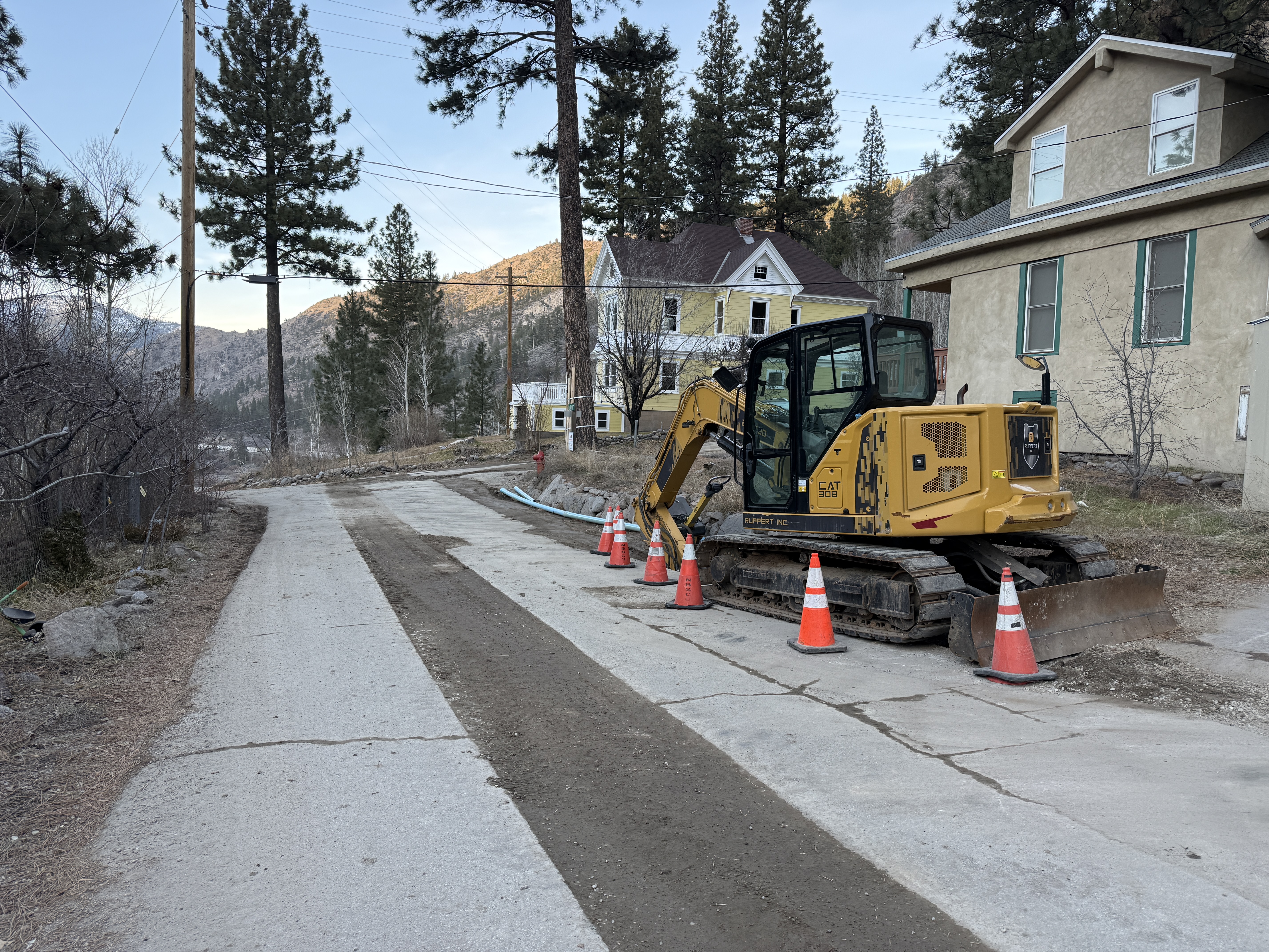 The image shows an excavator parked on a partially paved road, with traffic cones arranged around it. The road appears to have a dirt strip in the middle, bordered by more paved sections. There are houses in the background with visible trees and mountainous terrain beyond.