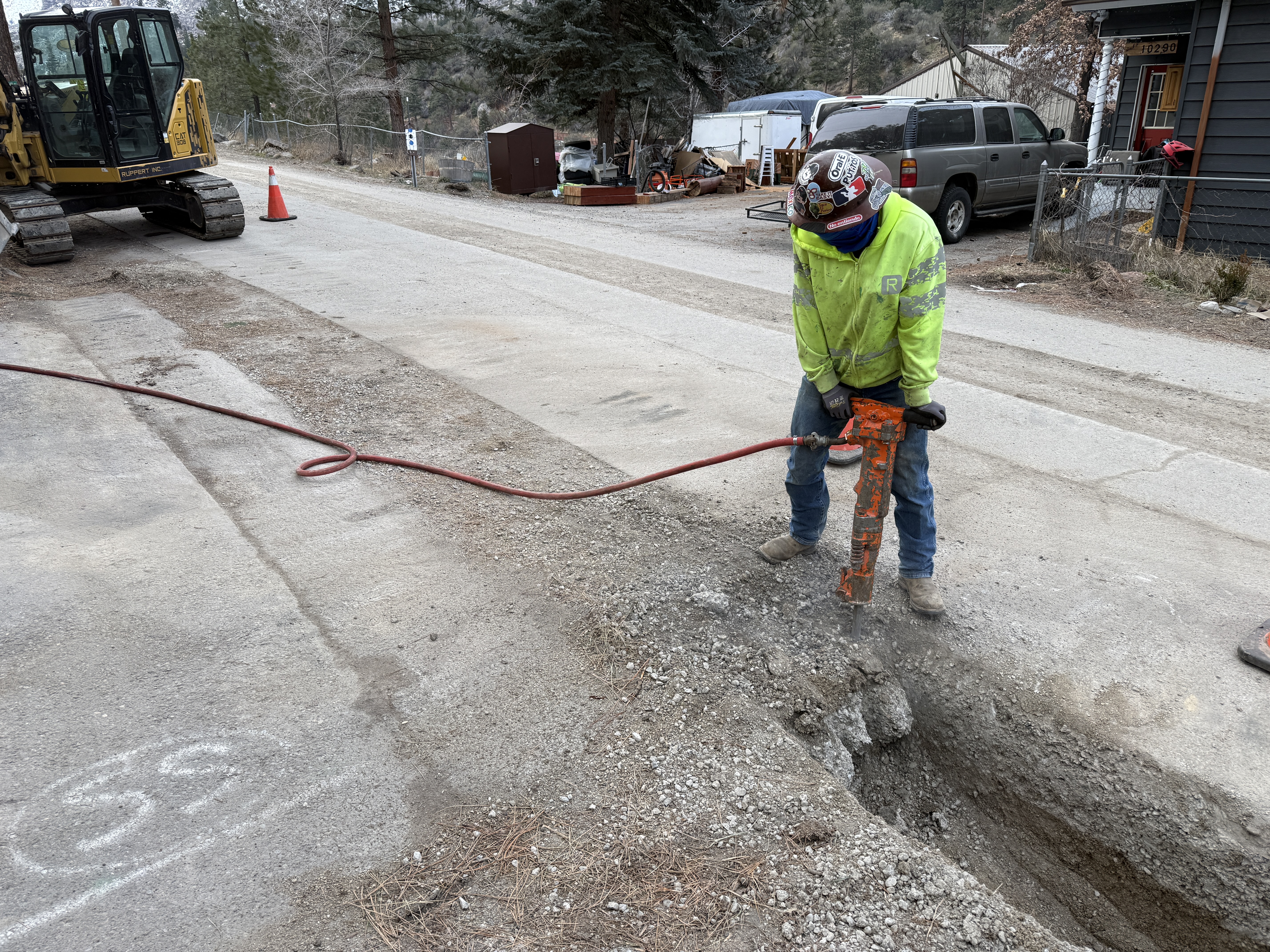 The image shows a worker using a jackhammer to break pavement, indicating trenching work on a road. An excavator is parked to the left with its boom lowered. Safety cones and an open trenching line mark the work area. The operator is wearing appropriate PPE including a hard hat, hi-vis jacket, and gloves.