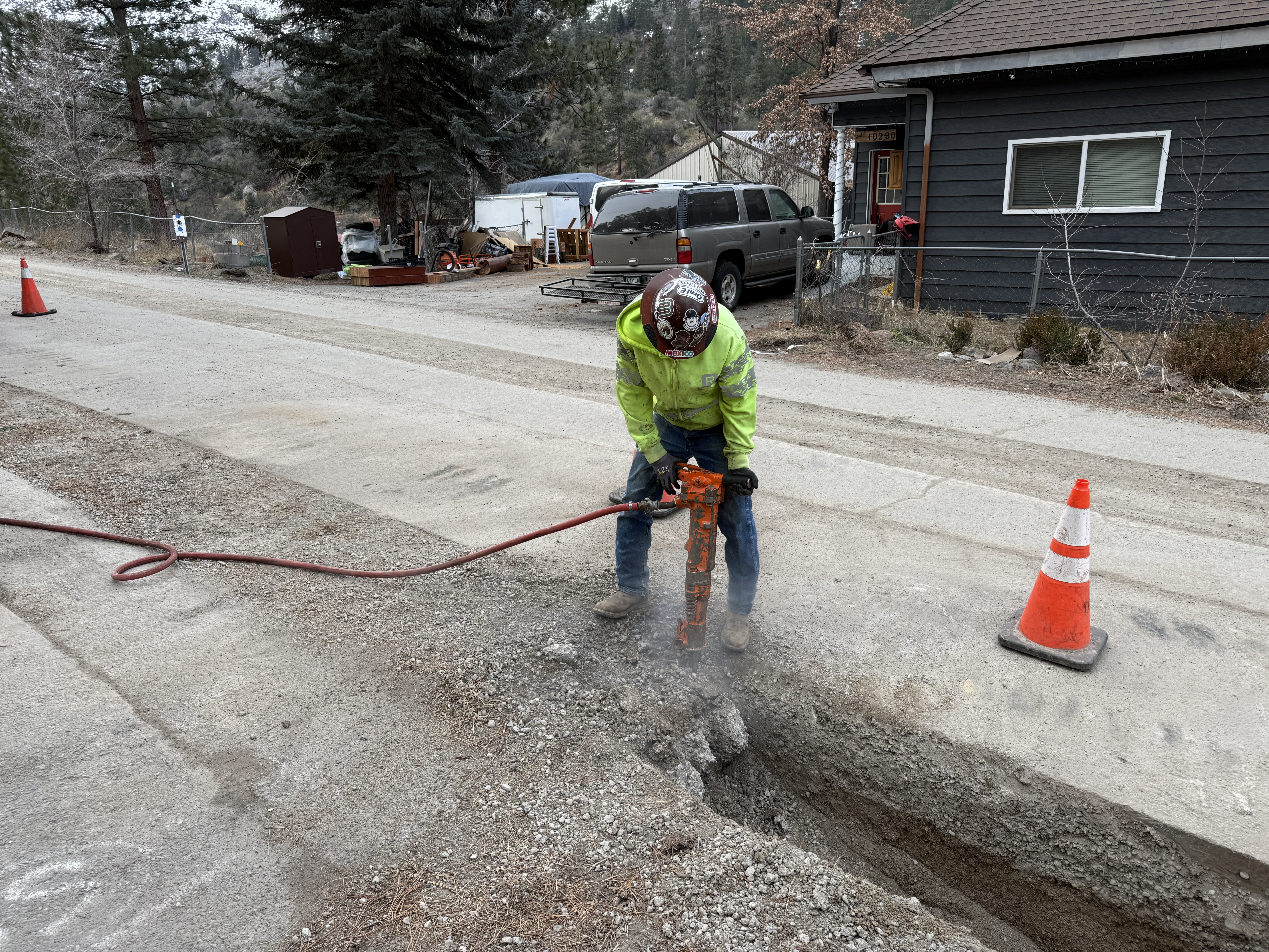 The image shows a worker in high-visibility clothing and a hard hat operating a jackhammer on a trench in the middle of a paved road. Traffic cones are placed around the trench area. The setting appears to be a rural or semi-rural environment based on the surrounding buildings and trees.