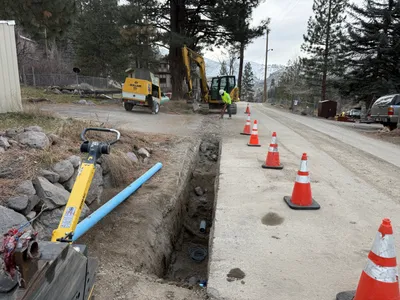 Safety measures include PPE and traffic cones around the trench.