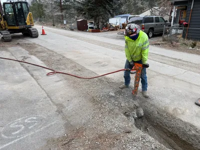 Safety cones are used for marking the trench, and standard PPE is visible on the worker.