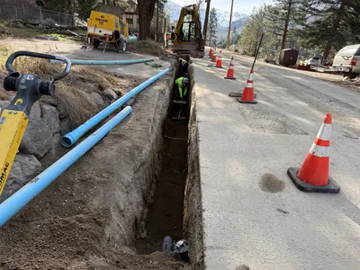 The image shows a trench dug along a dirt road, lined with orange safety cones. An excavator is visible near the trench, and a worker is present, suggesting active trenching work. A blue pipe is positioned alongside the trench, indicating drainage-related activities. The setting is outdoors in a wooded area with clear weather.