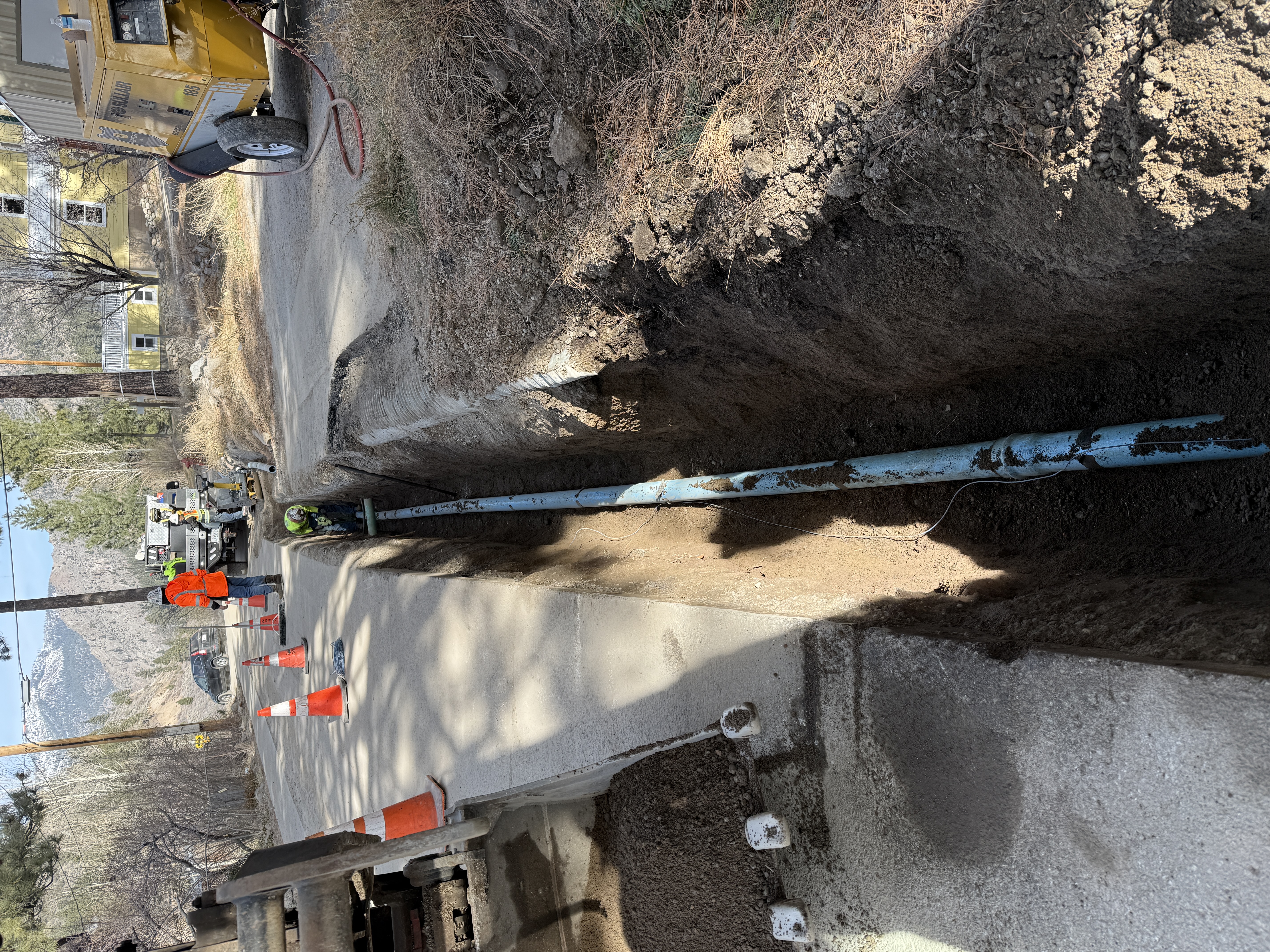pavement with trench in dirt sunny and clear winter day roadway partially blocked with equipment
