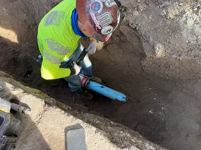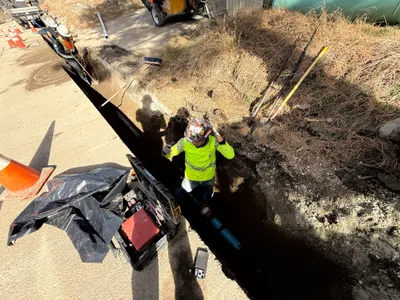 The image shows an open trench along a paved road where workers are installing a blue pipeline. Several workers are present, one of whom is in the trench, and there are traffic cones along the edge of the trench. A piece of heavy equipment is partially visible, and a portable air compressor is parked nearby.