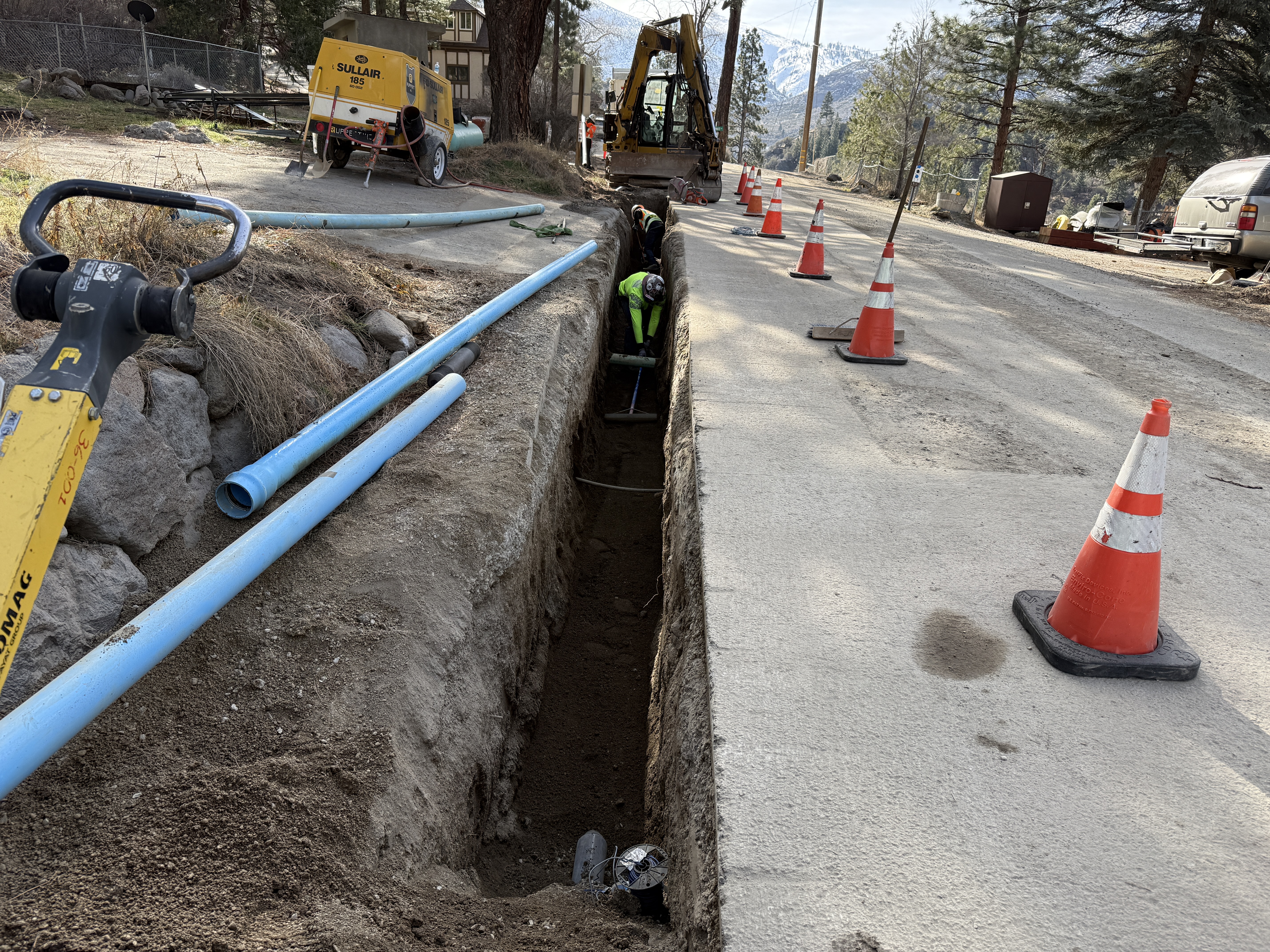 The image shows a trench being dug alongside a road, with a worker inside the trench. Blue pipes are staged nearby, and an excavator is visible in the background. Safety cones line the edge of the trench to indicate caution. Trenching activity appears to be focused on the installation or replacement of underground utilities.