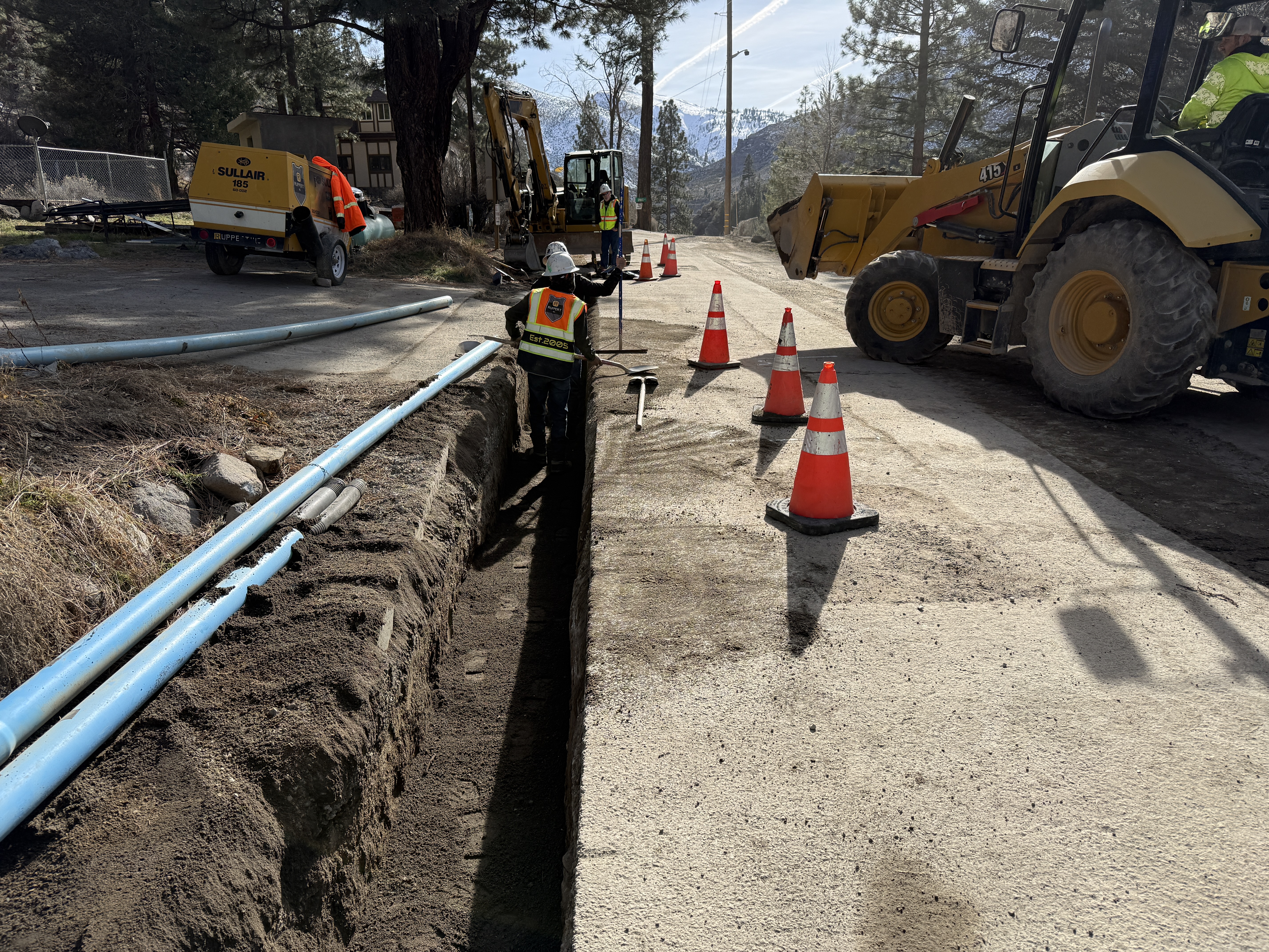 The image shows workers engaged in trenching along a paved road, with a trench dug adjacent to the pavement. Blue pipes are visible being laid or staged in the trench. Construction workers are wearing protective gear and several orange cones are placed along the trench line. Heavy machinery such as a backhoe loader and mini excavator are present on-site.