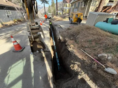 Safety gear such as hard hats and hi-vis vests are visible, and traffic cones mark the trench area.