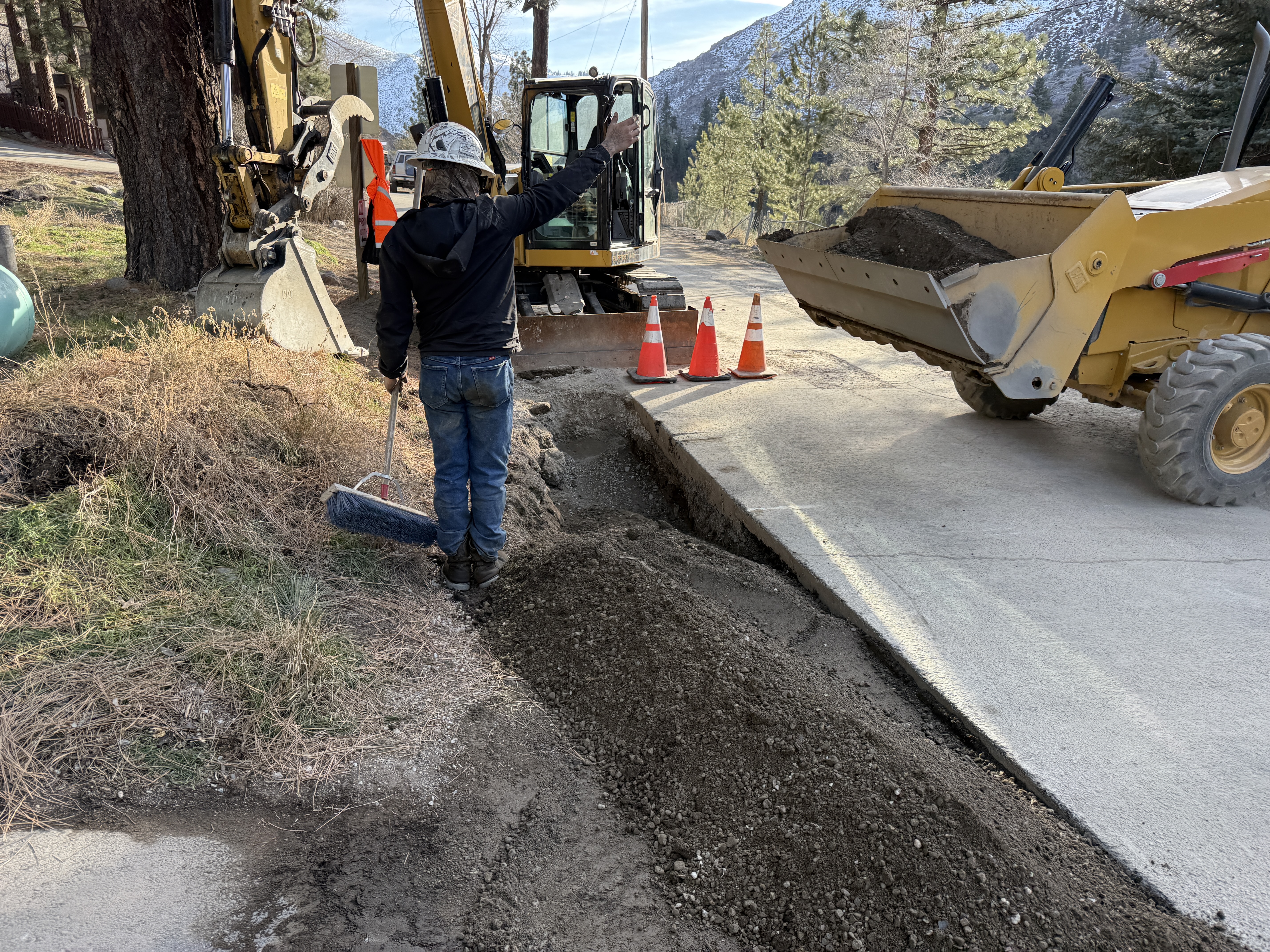 The image shows a trench being worked on with a person using a broom next to an excavator and a front loader. The trench runs along a concrete surface, with dirt piled alongside. Traffic cones are positioned along the trench, and the individual is wearing a hard hat and hi-vis vest, indicating safety precautions.