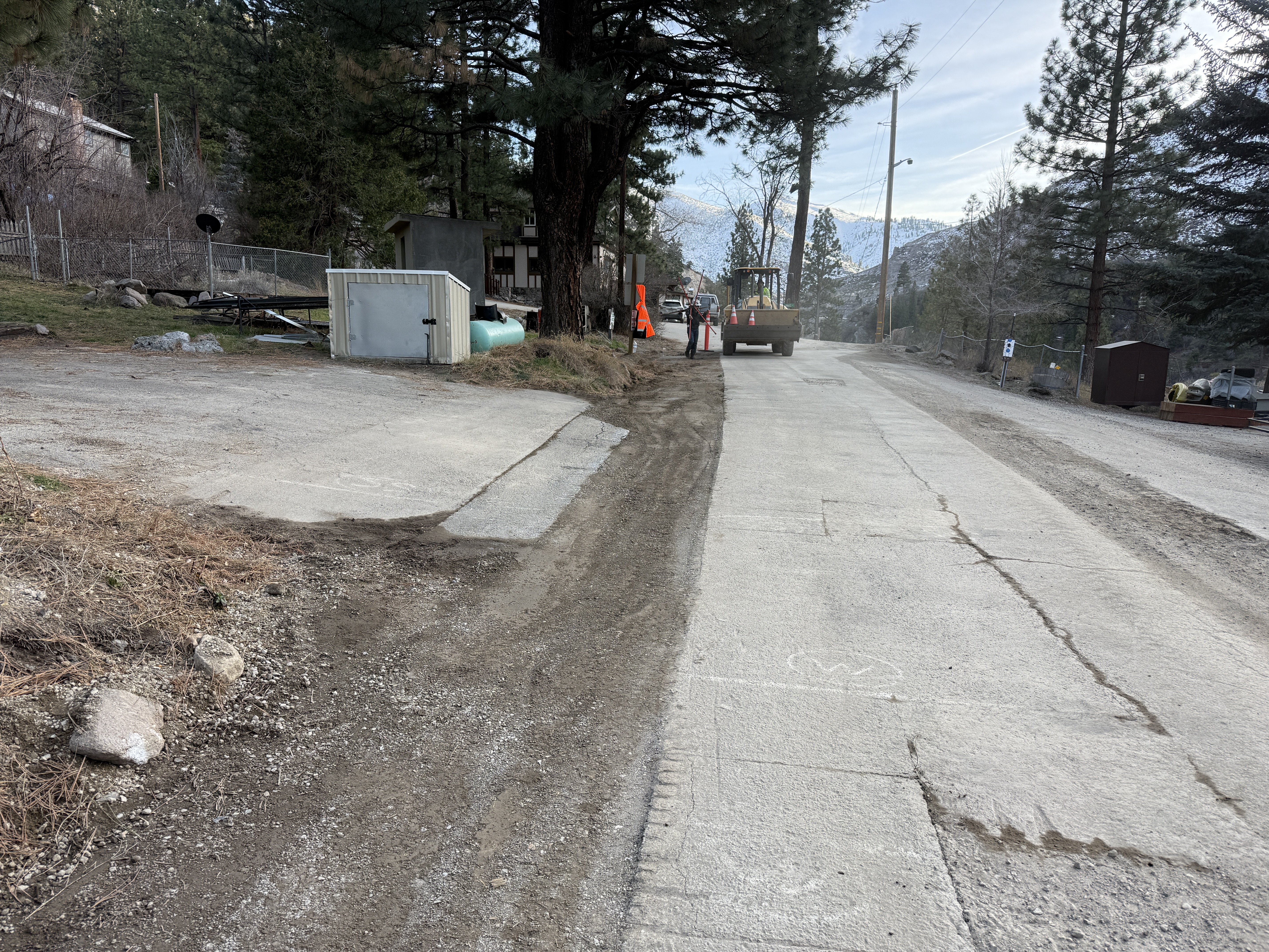 A construction vehicle is working on a rural road, with visible grading or surface preparation activity. Traffic cones are placed to indicate work in progress. The surrounding area shows trees and mountainous terrain, with evidence of prior surface alterations. The road consists of a mix of pavement and dirt.