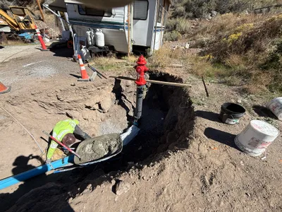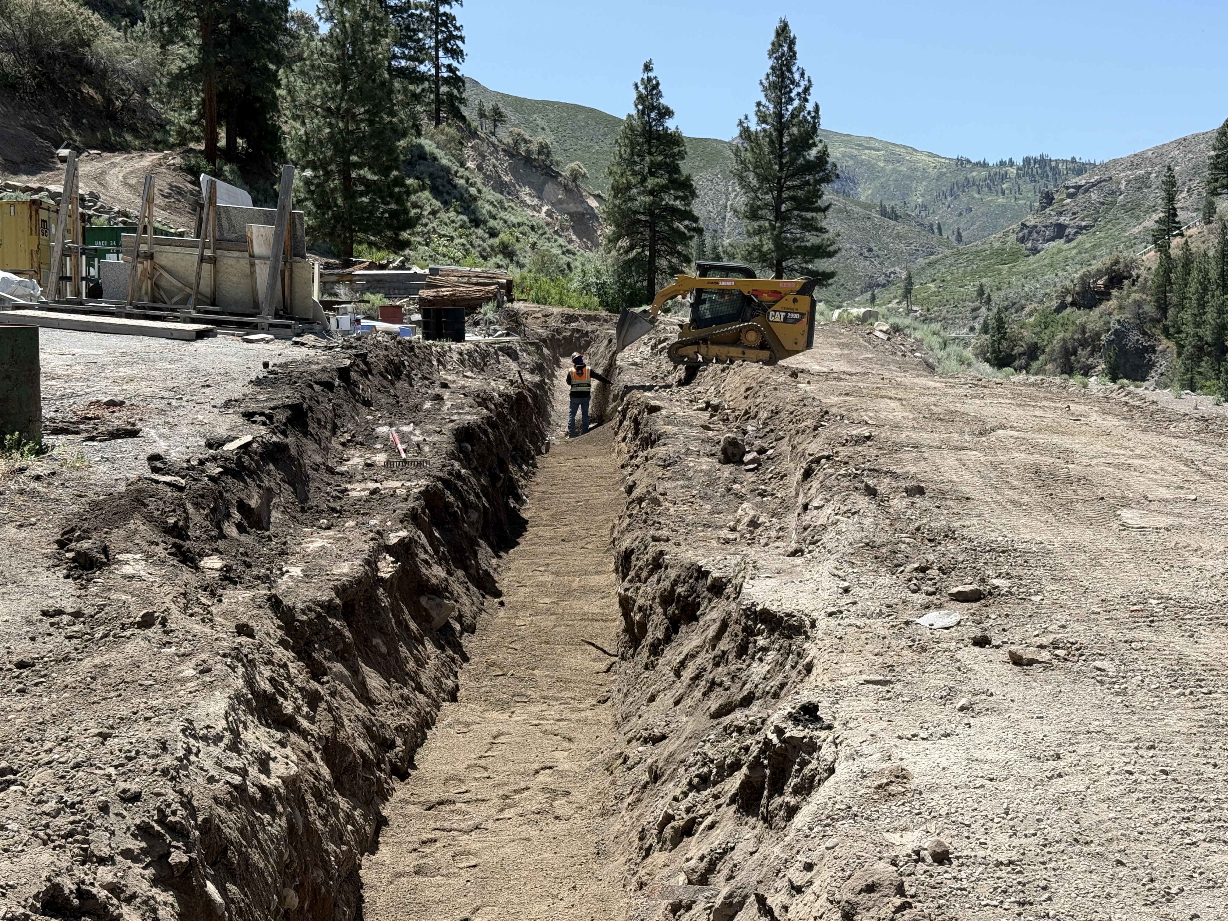 The image shows an open trench with a small construction vehicle, likely an excavator or loader, working nearby. A person wearing safety gear is visible inside the trench. The area includes visible staging materials and trees in the background. The trench is filled with soil, and the surrounding area appears to be rural with hills.