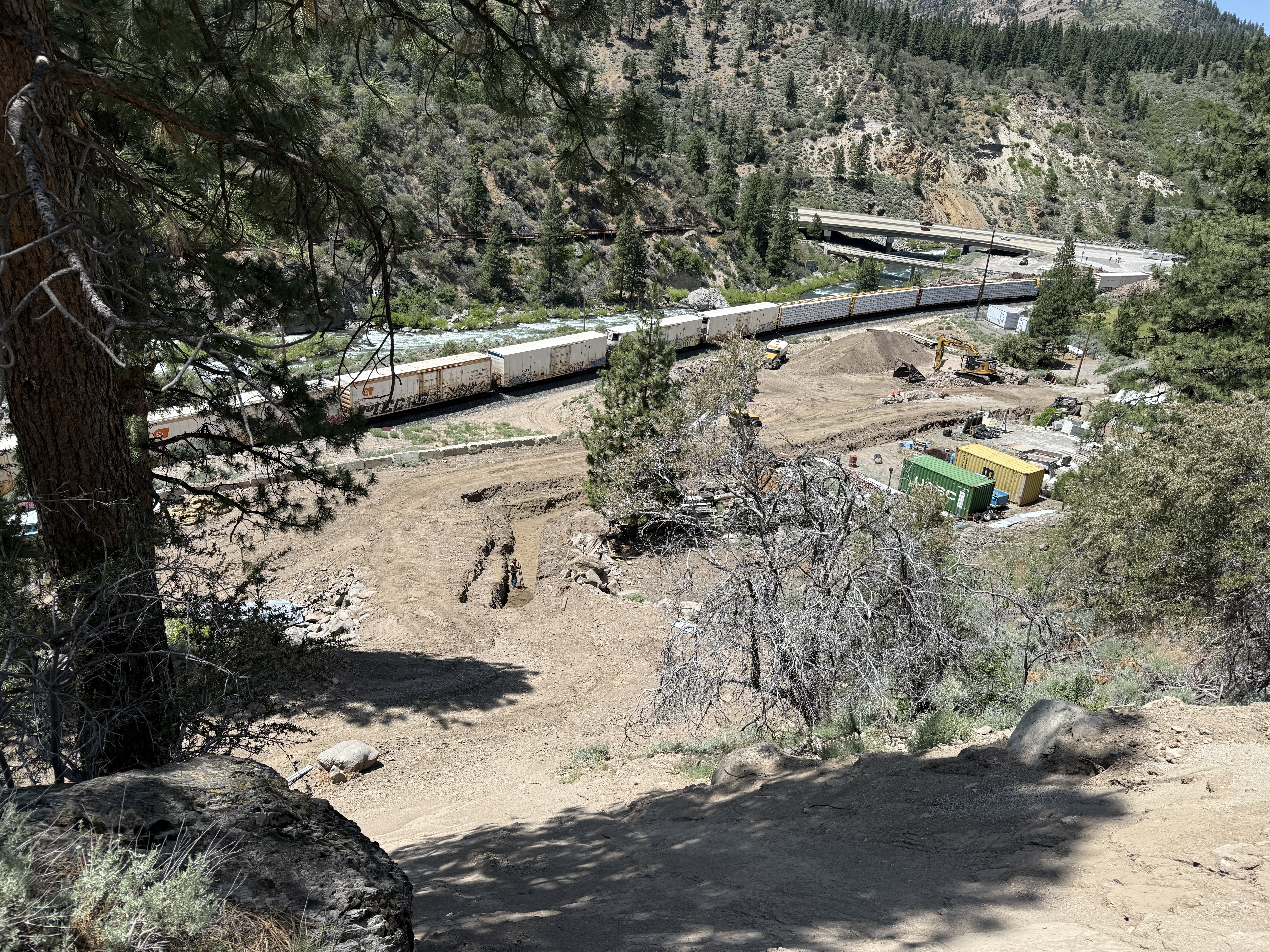 The image depicts an active trenching operation with a visible trench and workers in the foreground. Heavy equipment, including excavators, are seen near the trench area. Several shipping containers are staged nearby, and there is a train on a track in the background. The site is set within a forested and mountainous area.