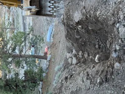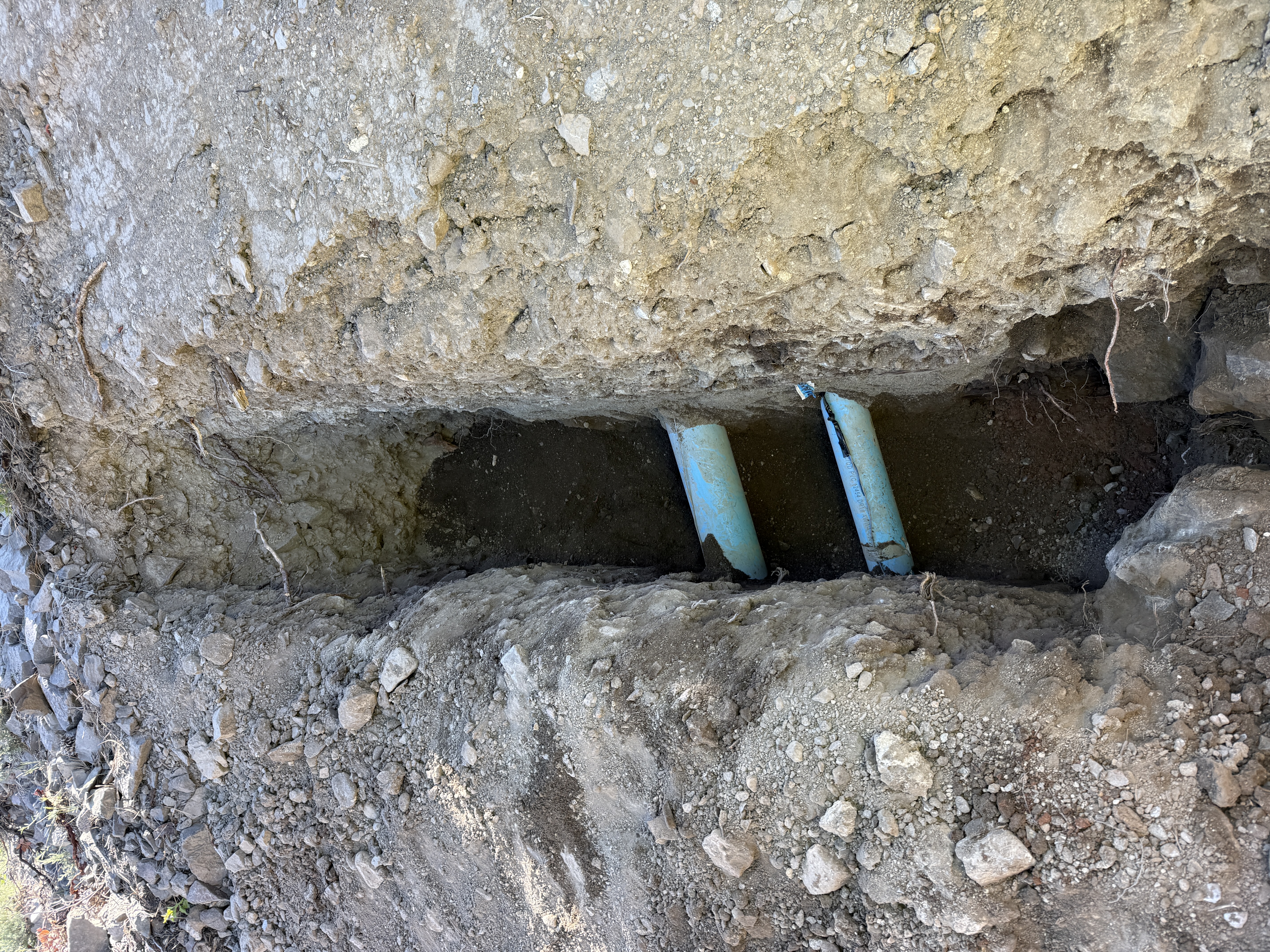 The image shows an open trench containing two broken blue pipes. The surrounding area consists of rocky soil, and there is an evident lack of protective measures or barriers. The trench is relatively deep, and parts of the pipes appear damaged with some soil and debris scattered around.
