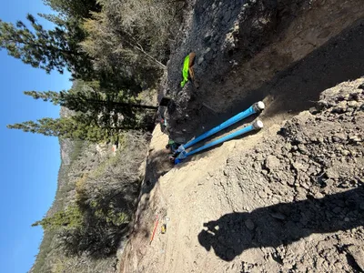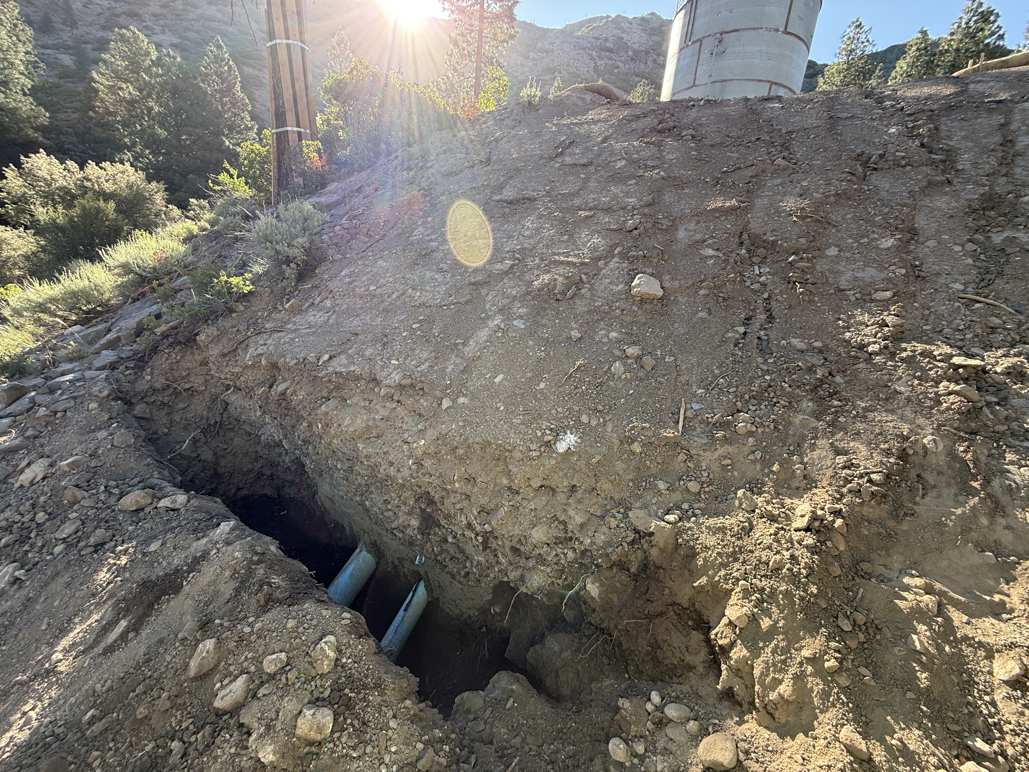 The image shows an open trench with at least two visible pipes emerging from the side. The area is surrounded by rocky soil and appears to be part of a hilly terrain with vegetation. There are concrete pillars or columns at the site and sunlight creating lens flare. No workers, vehicles, or machinery are visible in the frame.