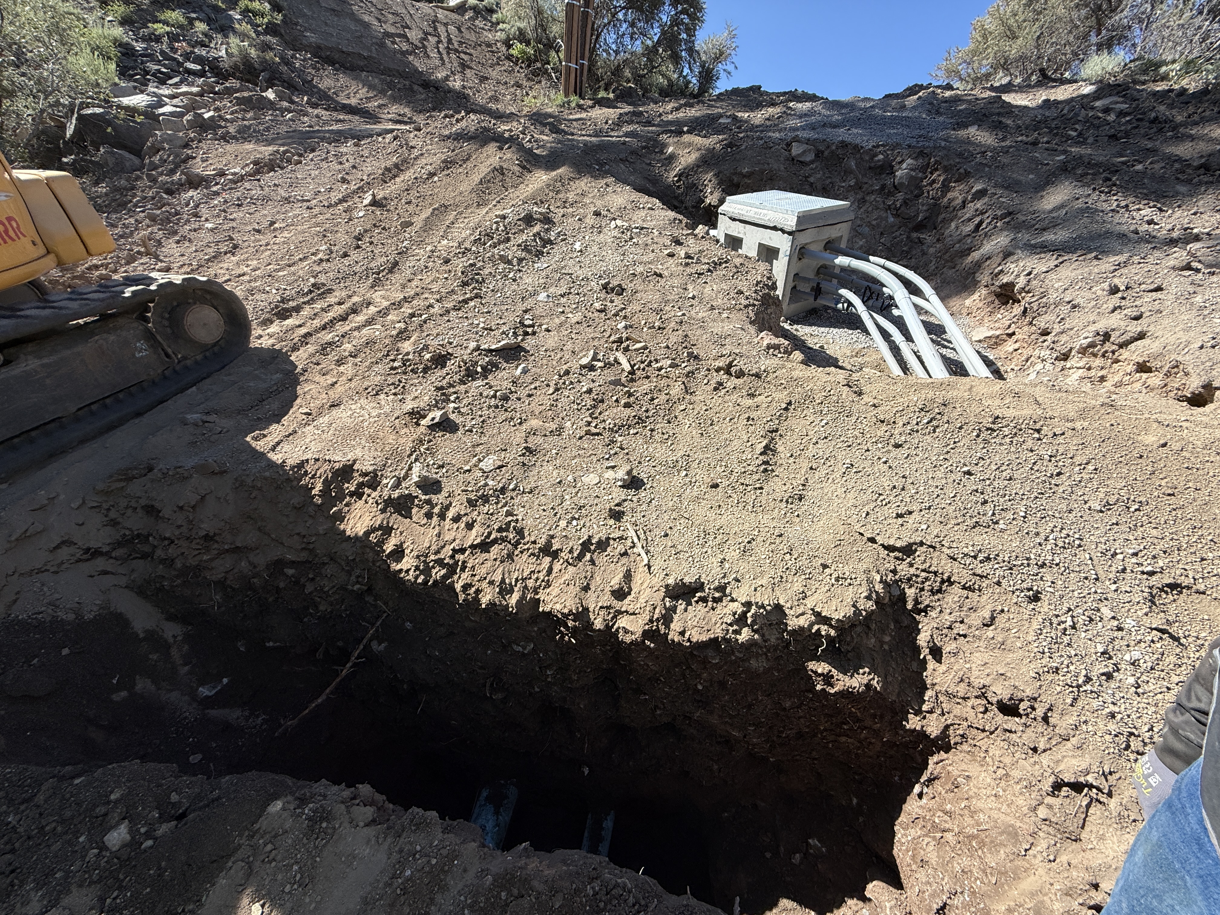 There is a large open excavation area with exposed dirt and soil. A concrete structure with multiple conduits exiting from it is visible at the top of the slope. Heavy machinery, possibly an excavator, is partially visible at the edge of the frame. No active work is occurring in the image.