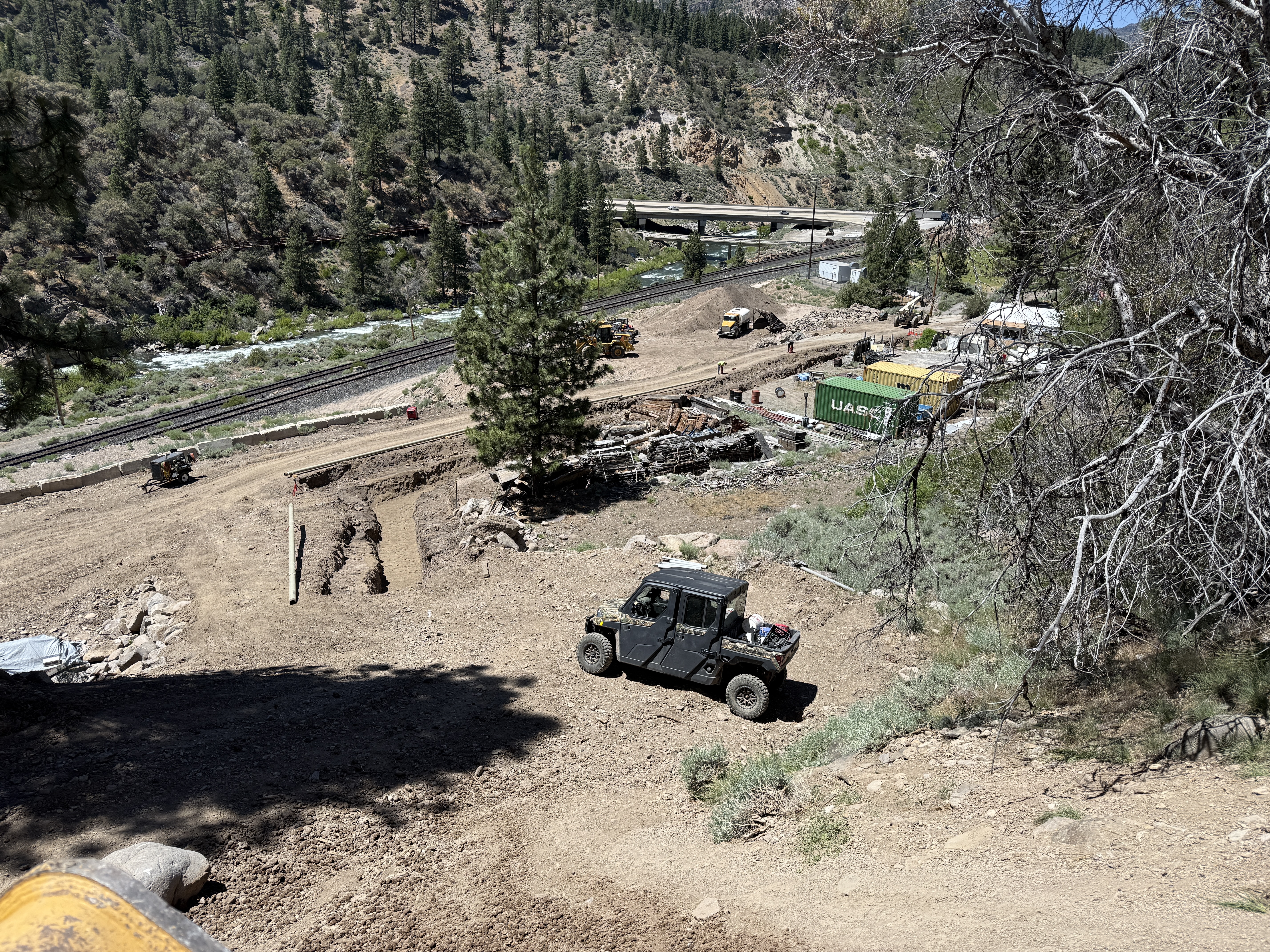 The image shows an active construction site with trenching activities. There is a trench dug in the foreground with some vehicles and heavy machinery nearby. Two storage containers are visible in the middle ground, along with various construction materials. The area is surrounded by natural terrain with some trees and a small river in the background.