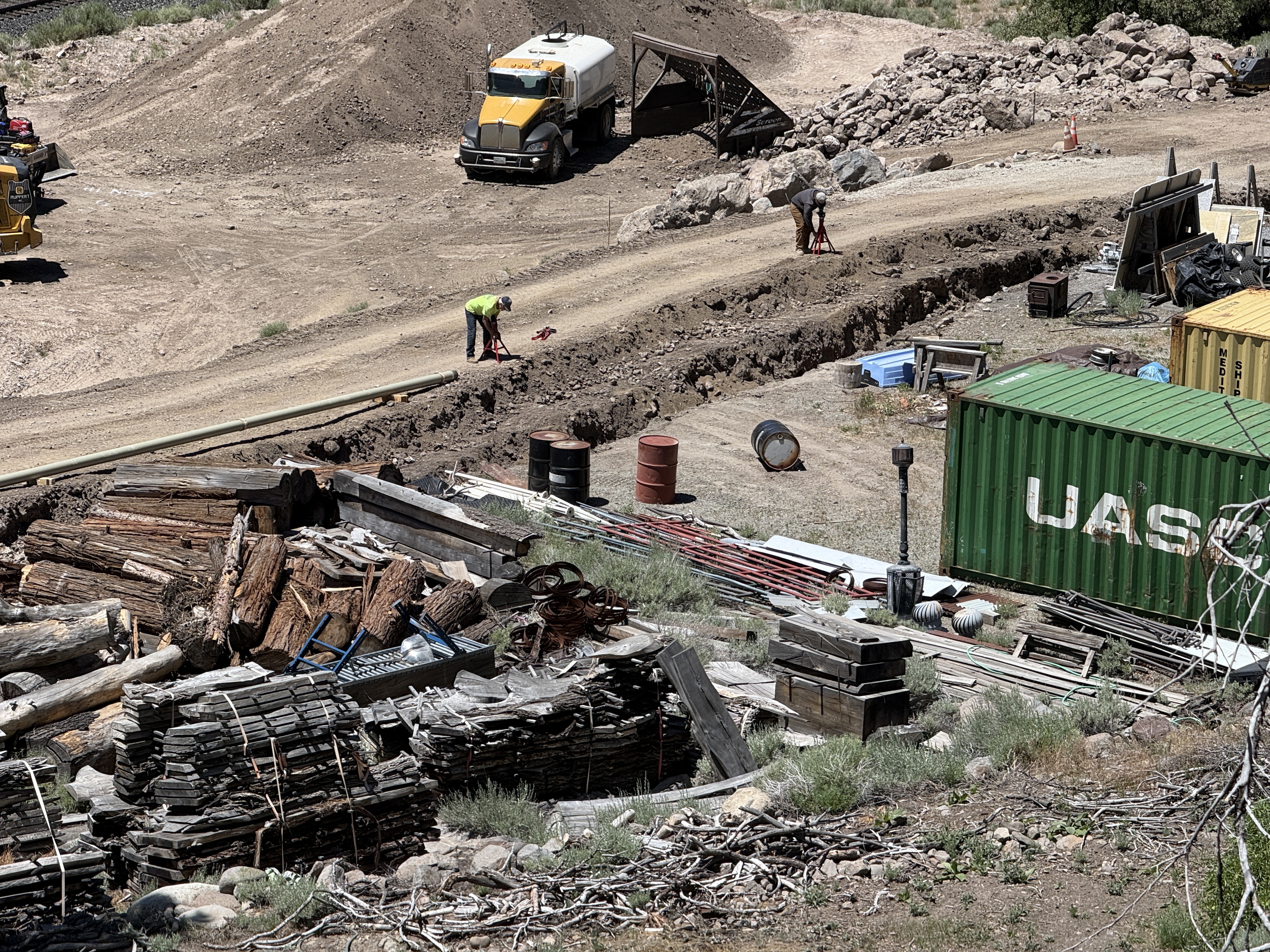 The image shows two workers performing trenching activities in a dirt area. A green storage container, piles of logs, pipes, and other construction materials are present. One worker is using a hand tool within the trench. A yellow and white truck and several barrels are visible in the background.