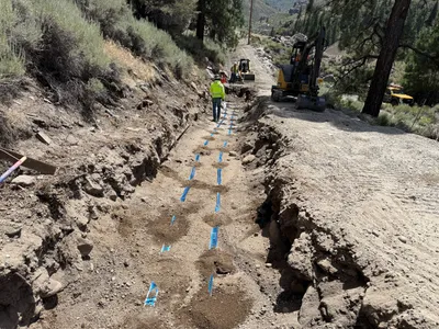 The image shows an open trench roughly rectangular in shape extending into the dirt. The soil around the trench is dry with some small stones scattered across the surface. No workers, machinery, or materials are visible within the frame. There are no safety barriers or equipment in view.
