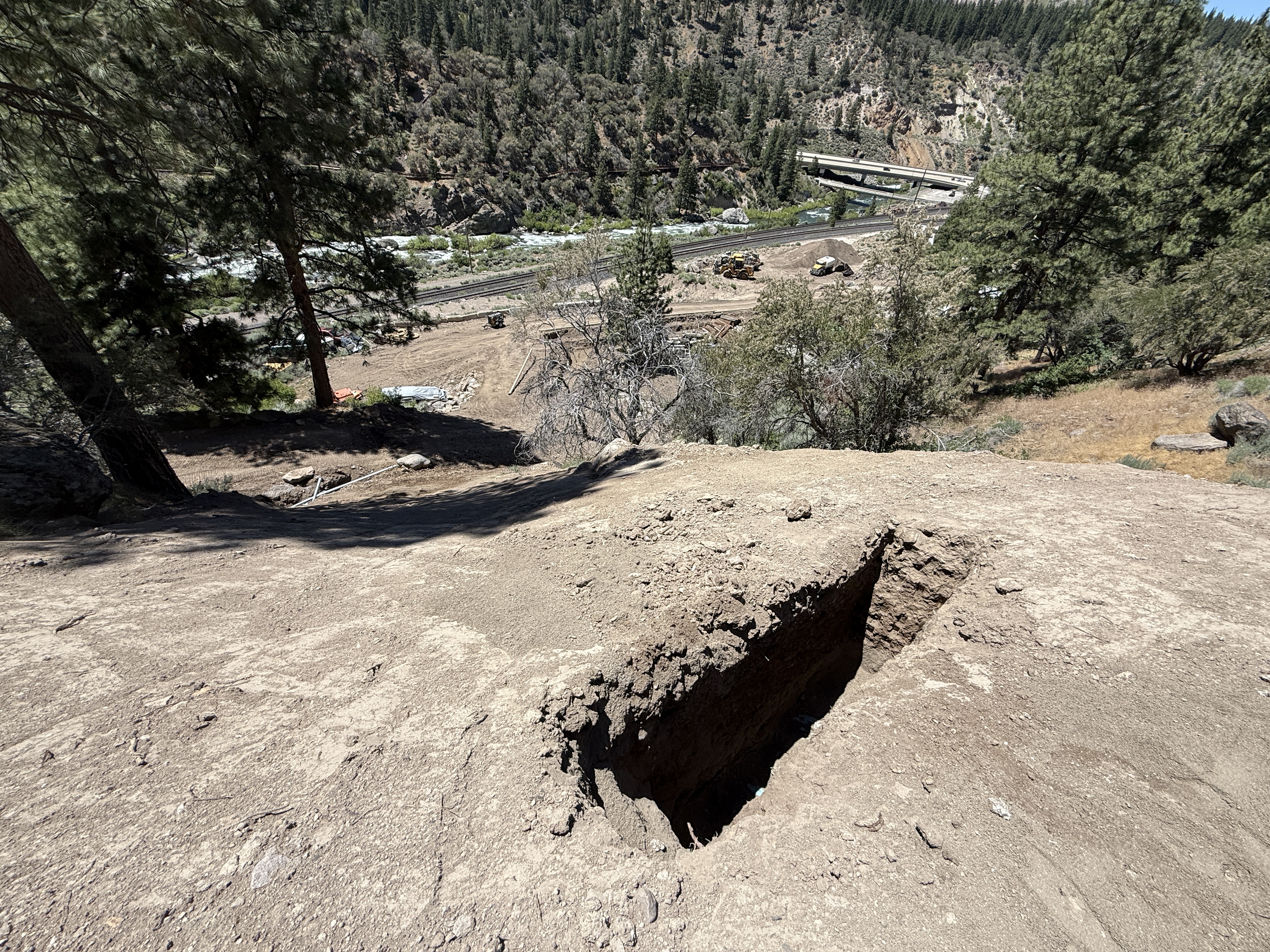 dirt slope with excavation hole clear sunny conditions limited access due to slope