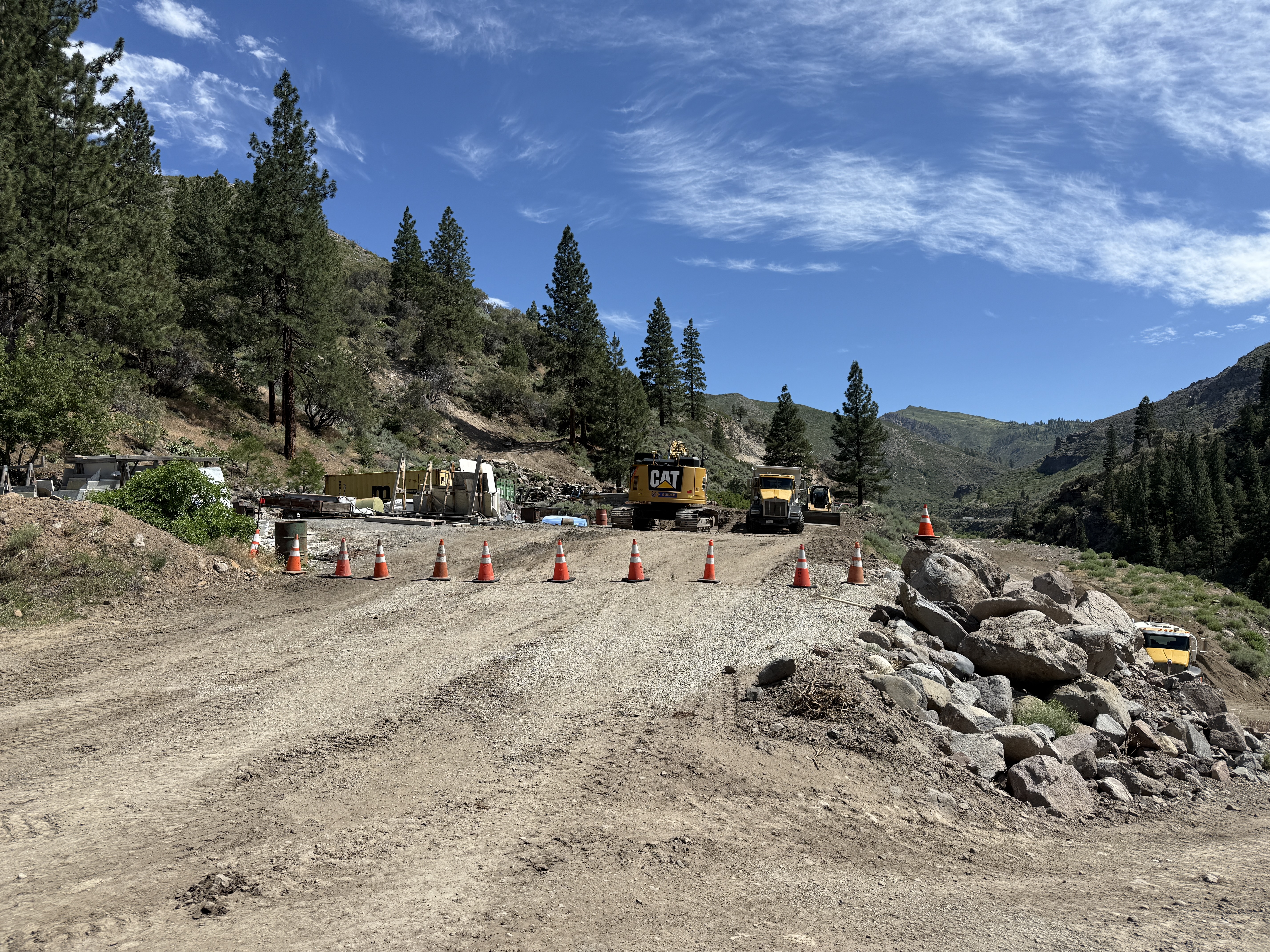 dirt road with gravel clear sky, sunny equipment positioned centrally, bordered by cones