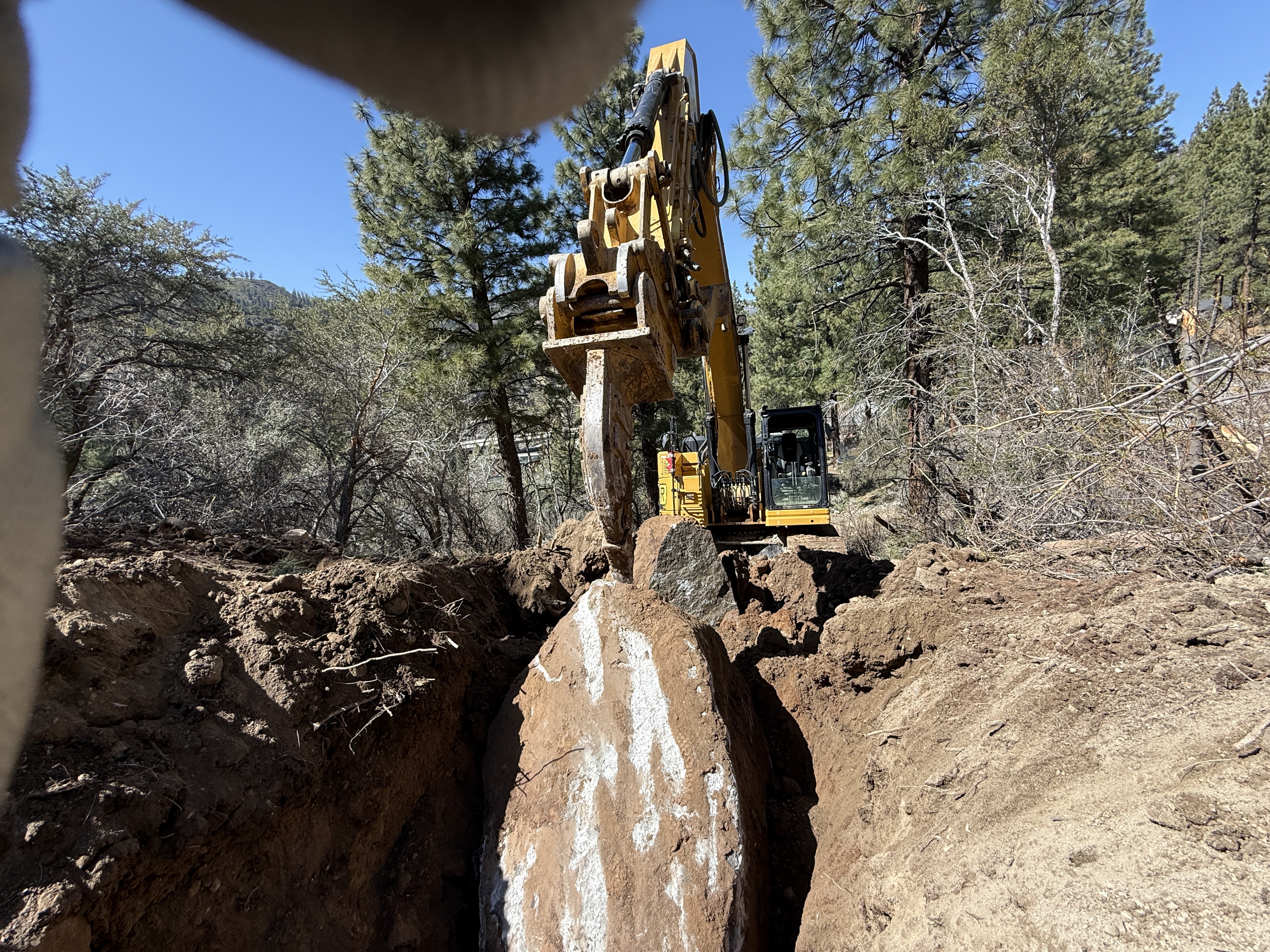 An excavator is actively engaged in trenching within a wooded area. A significant rock is present in the trench, with loose soil surrounding it. The scene takes place in a forested environment with visible trees and vegetation. The excavator is positioned above and to the side of the trench, working around the rock.
