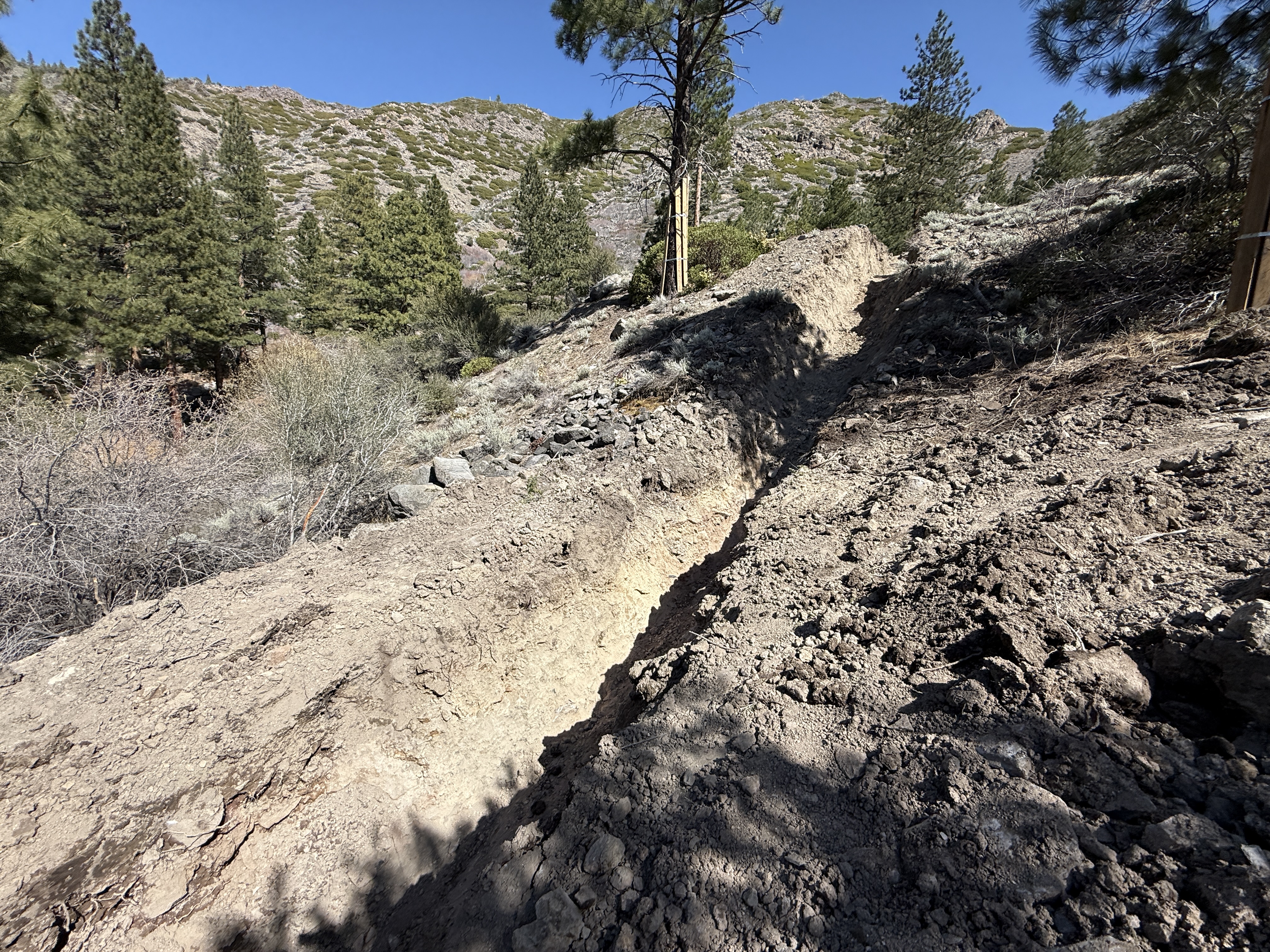 An open trench is seen running along a slope in a hilly area with vegetation around. The trench appears recently dug, with loose soil and some rocks visible on the surface. Pine trees are visible in the background indicating a mountainous location. The trench seems to follow the contour of the land but has no visible pipeline or equipment inside.