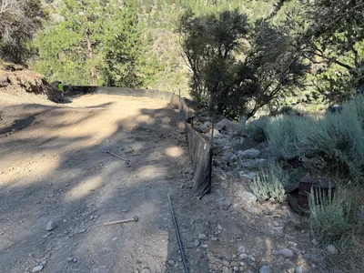 The image shows a tracked excavator operating on a slope amidst trees and rocky terrain. The excavator appears to be engaged in excavation work, clearing or reshaping the land. A section of hose or pipe is visible on the ground in the foreground. The setting is a forested area with a mountainous backdrop, indicating potentially challenging site conditions.