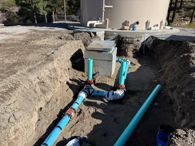 The image shows an open trench running down a slope in a forested area. The trench appears recently excavated with loose soil on the sides. Trees are positioned on either side of the trench, and a house is visible in the background indicating proximity to residential areas. The activity seems to involve some form of trenching or excavation work.