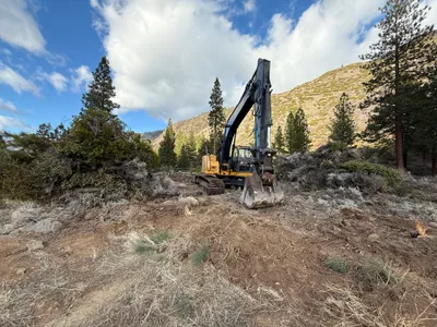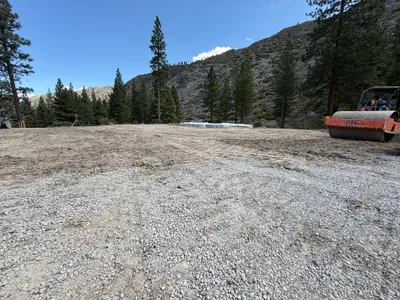 The image depicts a construction site with heavy machinery and materials laid out on a gravel surface. Two bulldozers and an excavator are lined up to the left, while blue pipes are stacked on the right. Additional materials are wrapped and palletized near the pipes. The setting is an open area with mountainous terrain in the background, indicating outdoor conditions.