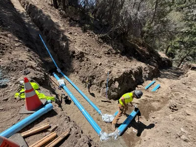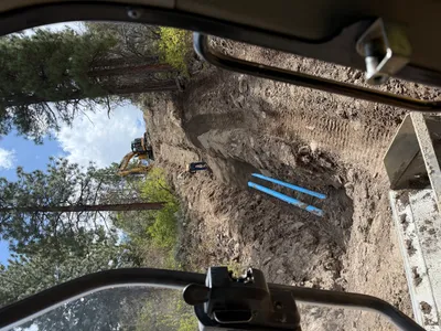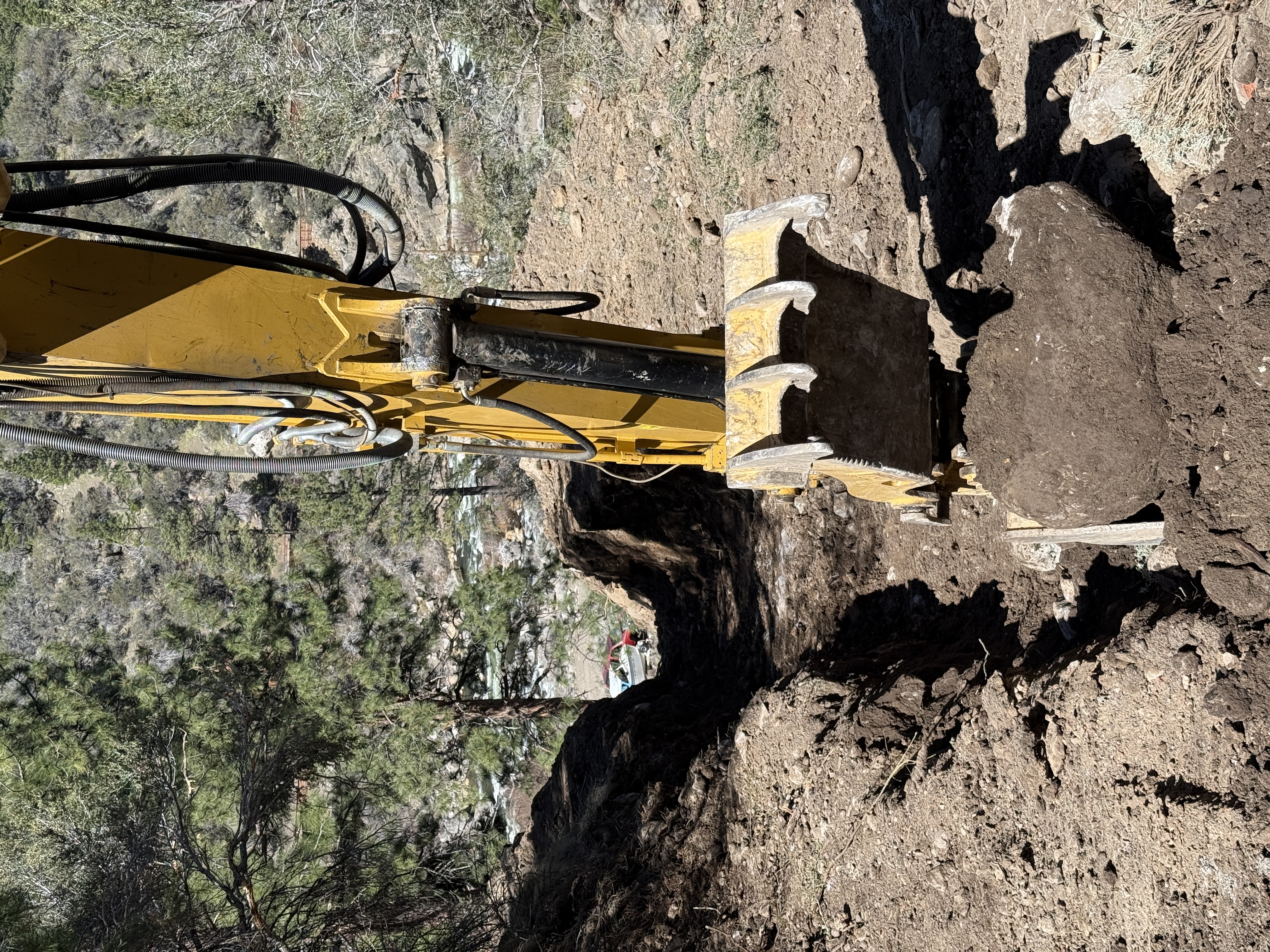 The image shows an excavator actively engaged in trenching work on a sloped area with visible disturbed earth and removed rock or soil. The excavator’s arm and bucket are prominently visible, holding a large clump of soil. The background features trees and a sloping terrain, suggesting a remote or forested location. No clear visual indication of utilities, piping, or installation is present.