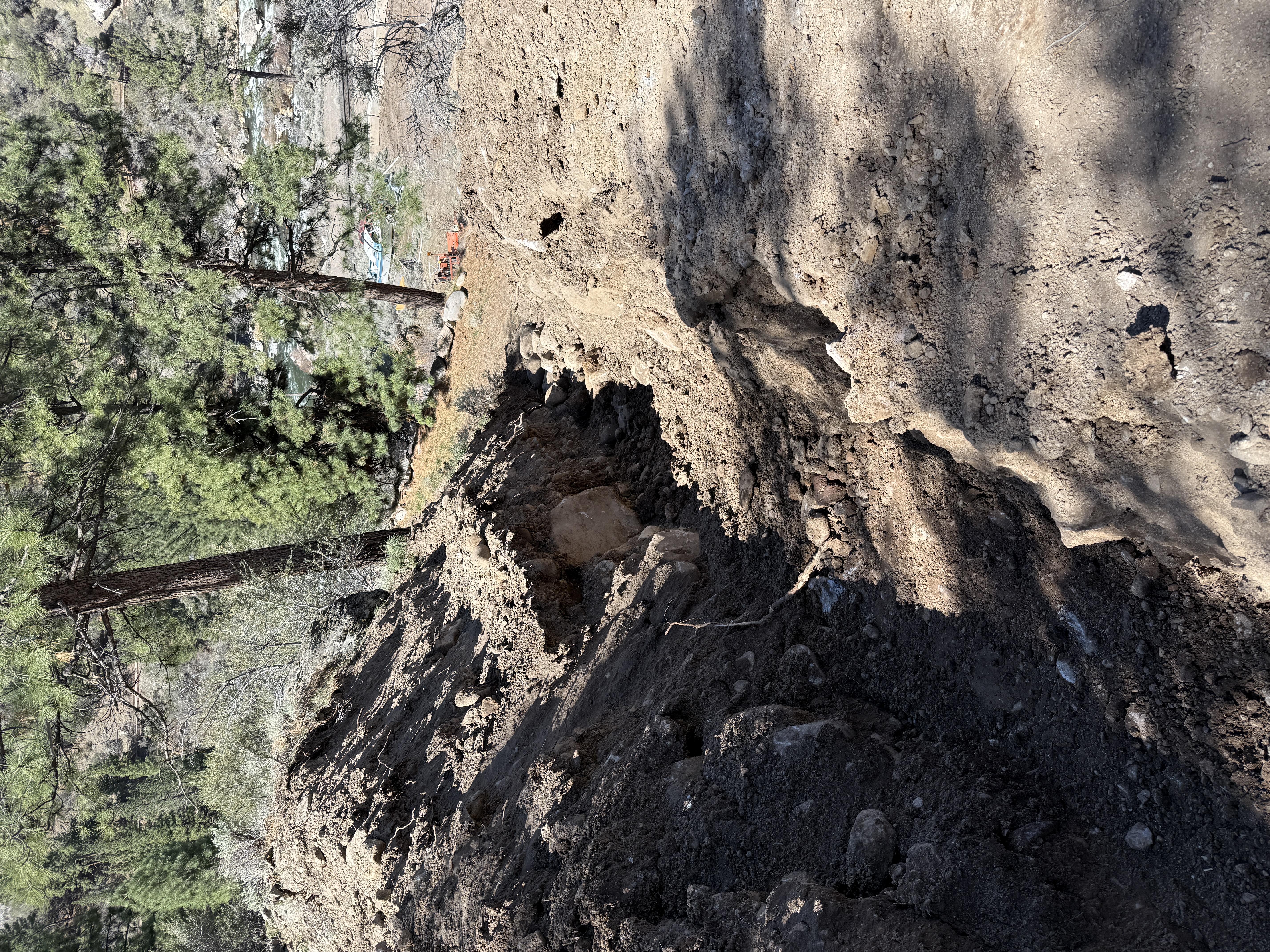 A narrow trench cuts through a hillside leading downhill, with visible earth and rocks lining the sides and bottom. The trench appears to have been recently excavated, with loose soil and exposed roots visible. Tall pine trees border the area, and the trench seems to lead toward a lower area where some equipment is seen in the distance. The exact purpose or phase of work is unclear based on the image alone.