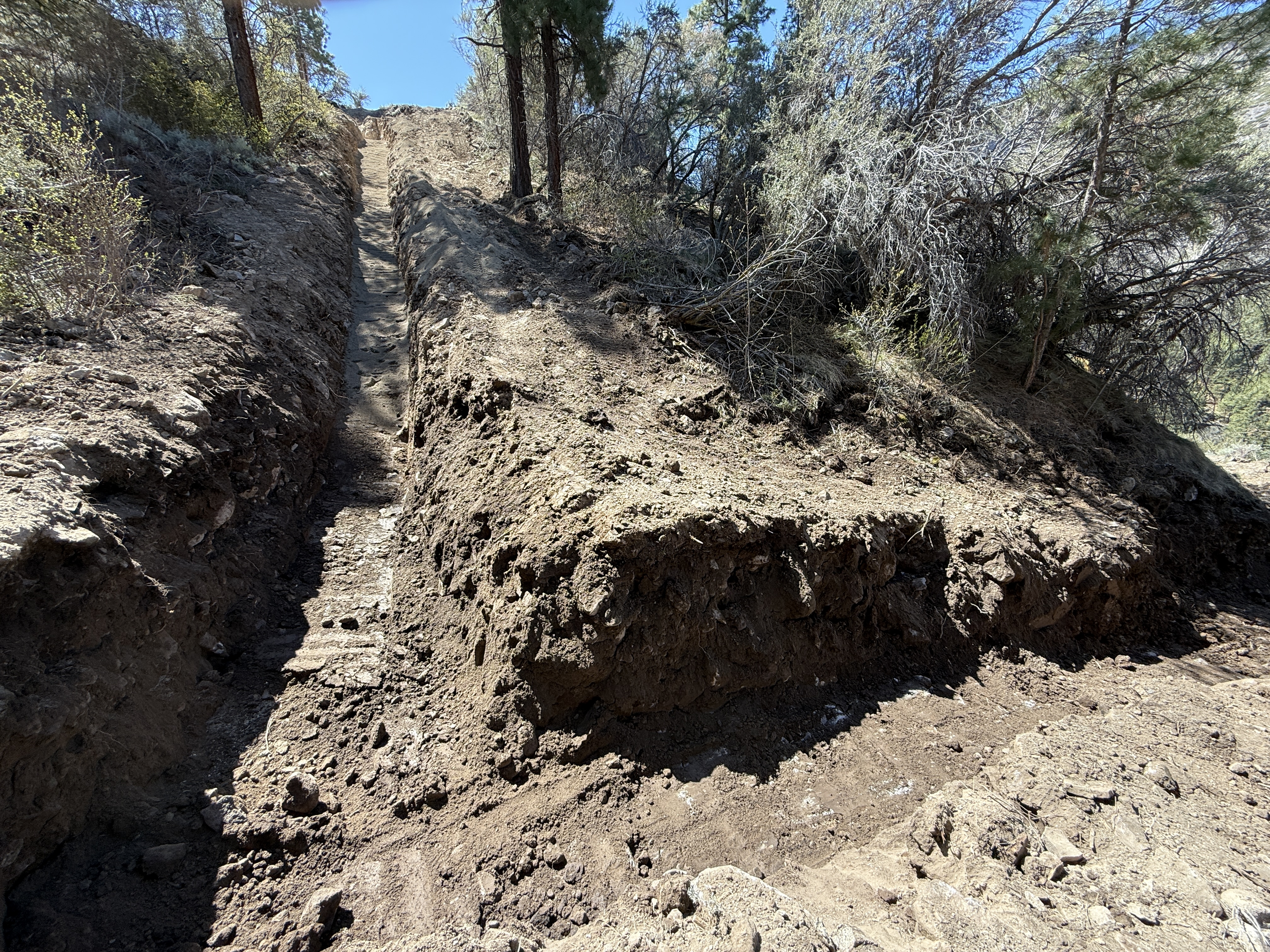 The image shows a freshly excavated trench running up a slope in a wooded area. The trench has straight, well-defined edges and is filled with loose dirt and soil clods. No construction equipment or personnel are visible in the image. This appears to be a preliminary phase of excavation with no visible safety measures like barriers or trench boxes in place.