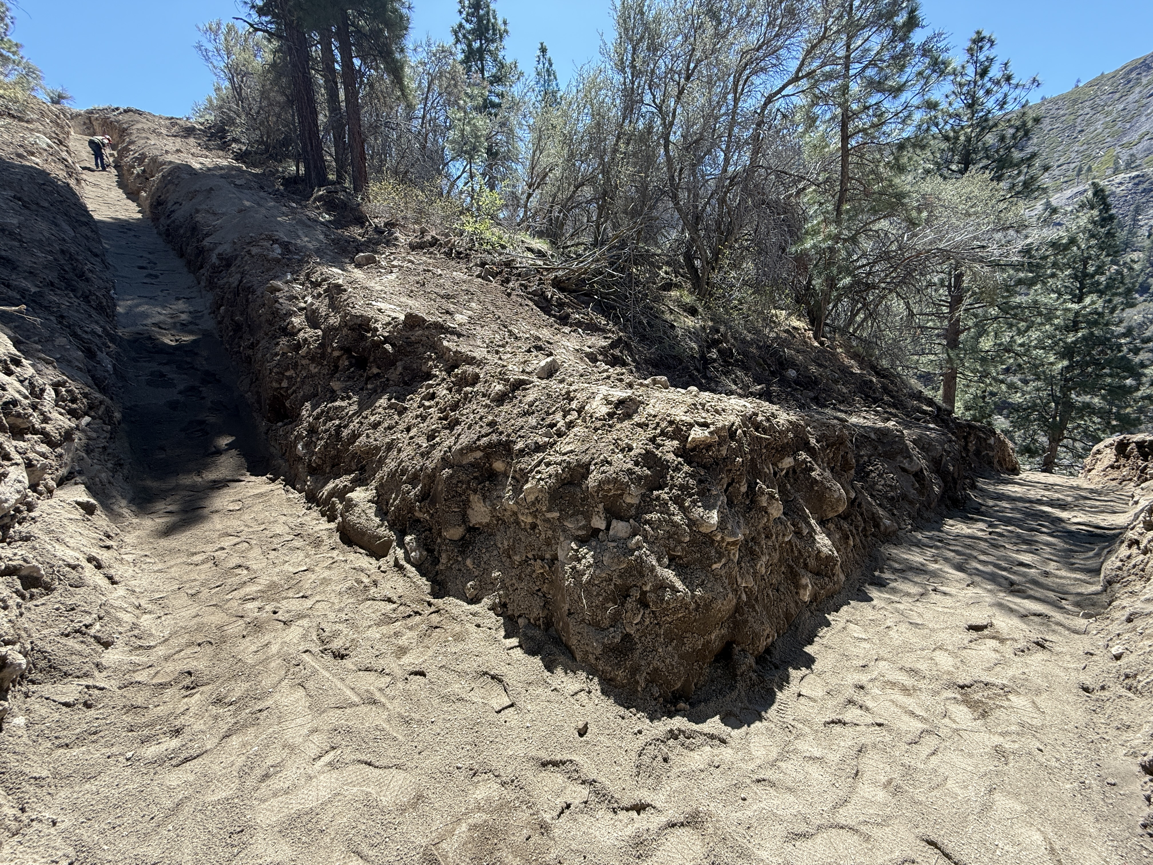 A trench is cut into a slope, with a steep incline visible on the left side. The soil is piled along the edges of the trench, and a person is visible at the top of the incline. Trees and vegetation surround the area, indicating an outdoor site with natural terrain.