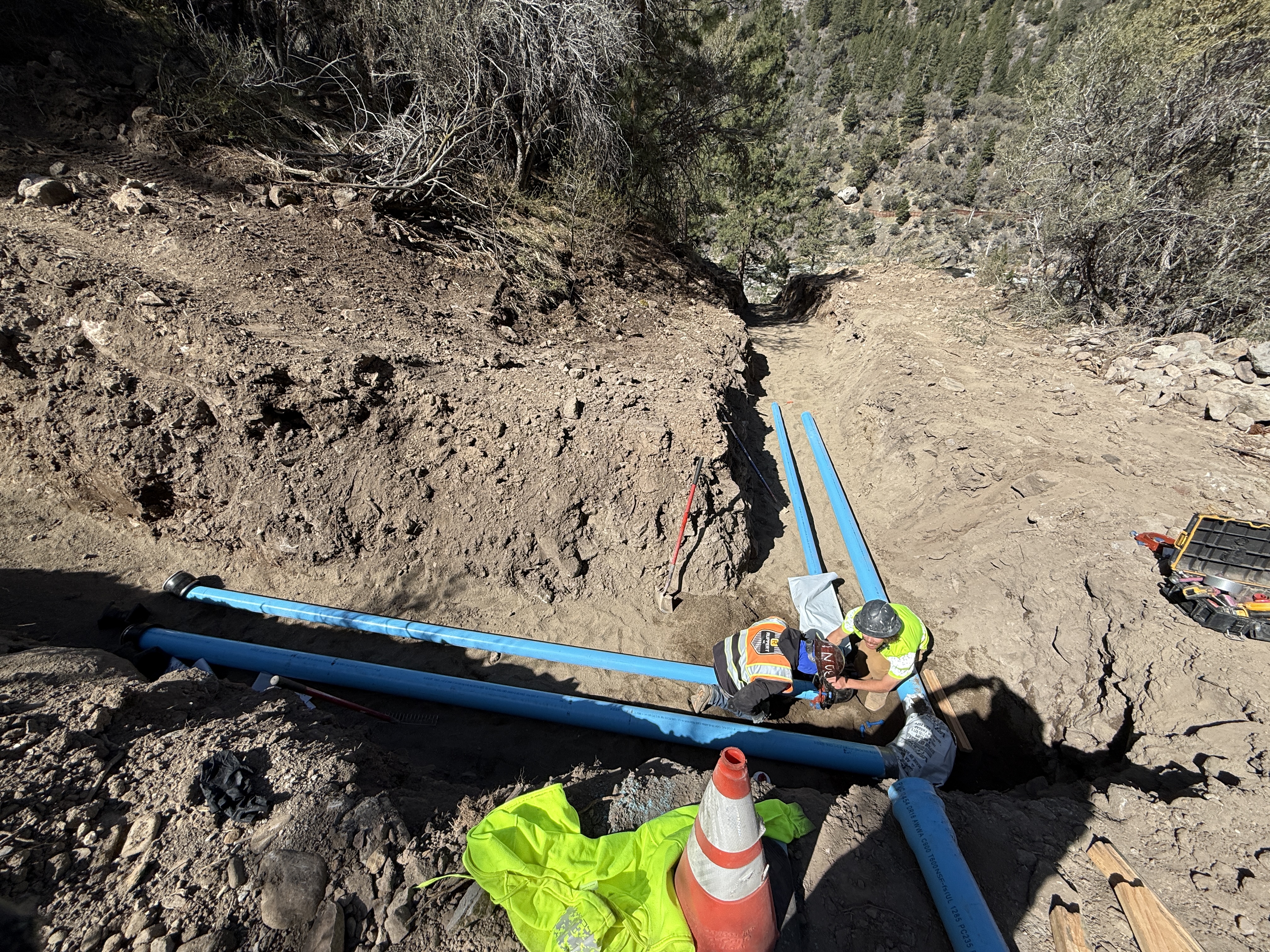 The image shows an active trench along a hillside where several blue pipes are being aligned by workers. One worker is visible in the trench, wearing safety gear including a hard hat and high-visibility vest. A traffic cone marks the work area, and the ground appears uneven with dirt and rocks. The scene is well-lit by natural sunlight, and sparse vegetation surrounds the site.