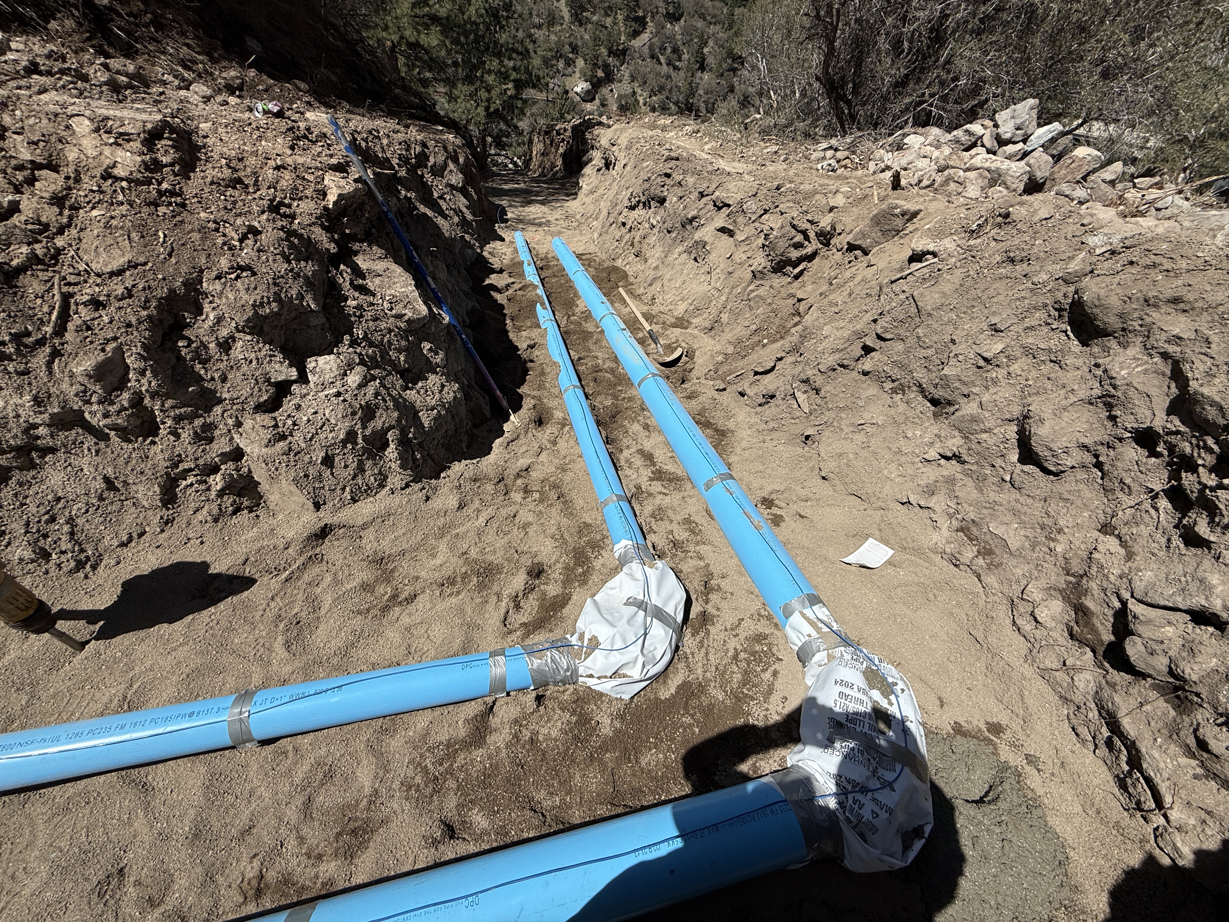 Several blue pipes are positioned within an open trench, forming a network with visible joints. The pipes are partially covered by sand or soil, and no additional equipment or machinery is visible in the immediate vicinity. The area appears to be part of a pipeline installation activity, possibly for water transport. The trench walls are earthen, and the surrounding environment is dry and rugged.