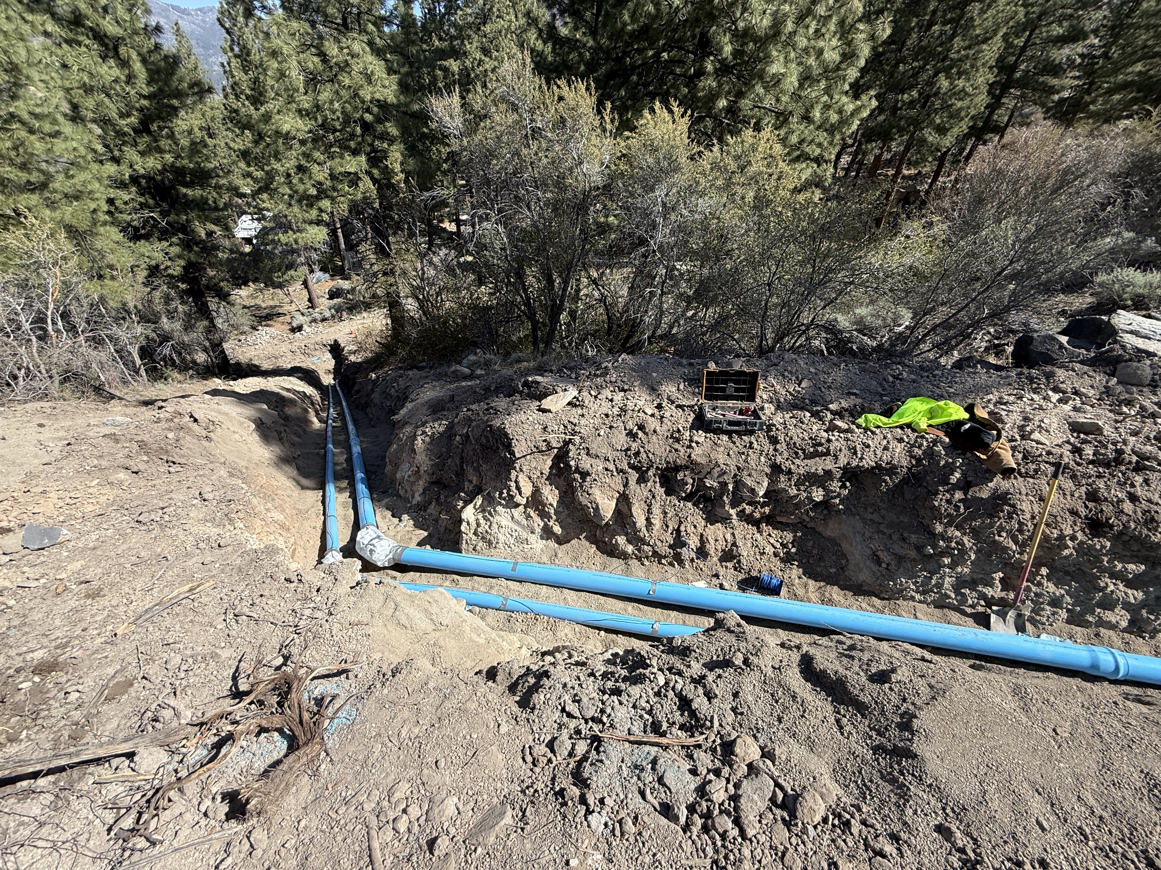 Two blue pipes are laid in a trench running through a wooded area. An open toolbox and a piece of safety apparel are positioned on the side of the trench. The trench is surrounded by natural earth and sparse vegetation. Installation of underground piping appears to be in progress.