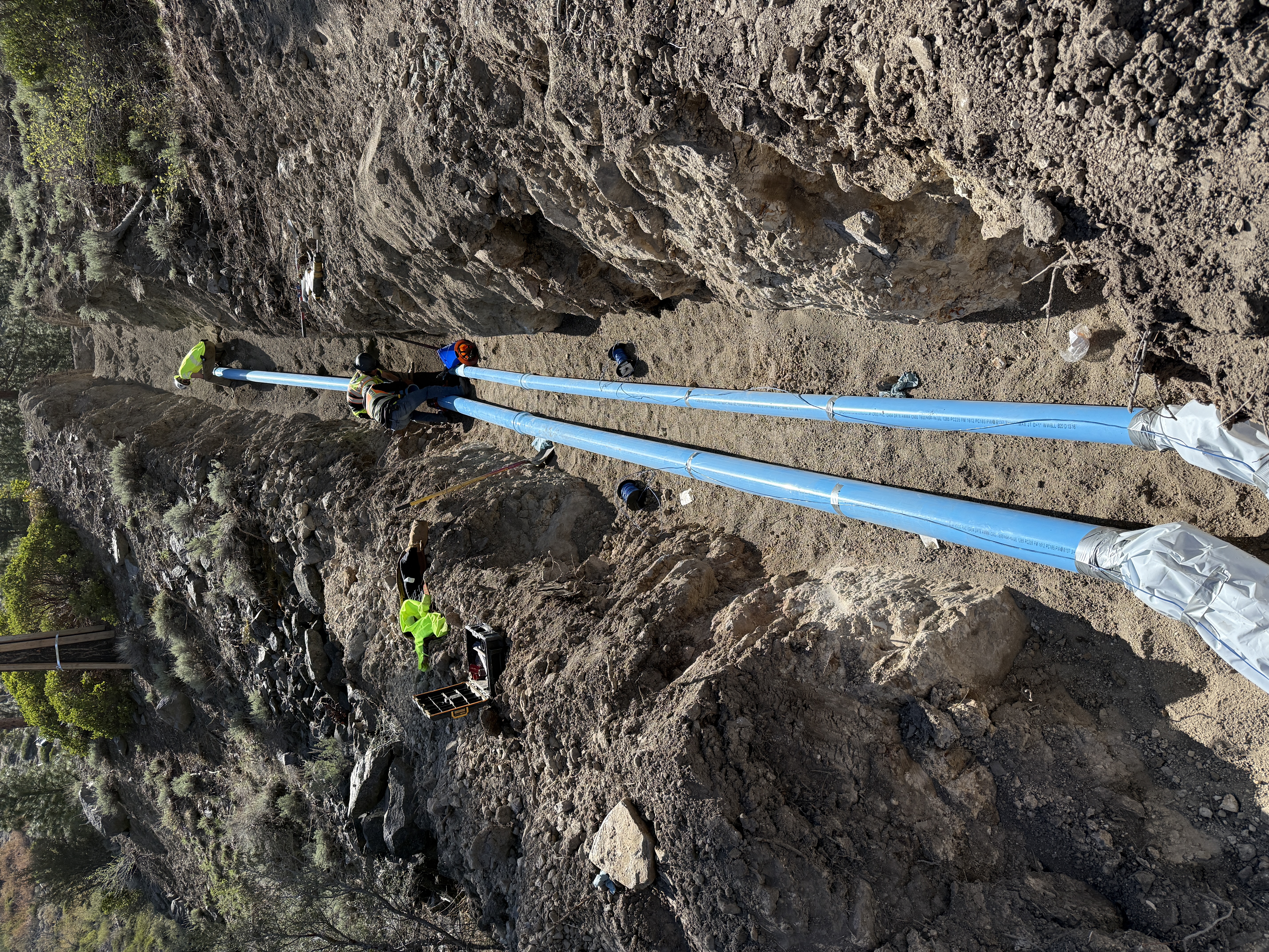 Two workers are seen installing blue pipes in a trench. The trench is cut through rocky soil and slopes uphill. Workers are wearing high-visibility vests and are actively engaged in connecting the pipes. Various small tools and equipment are scattered around the work area.
