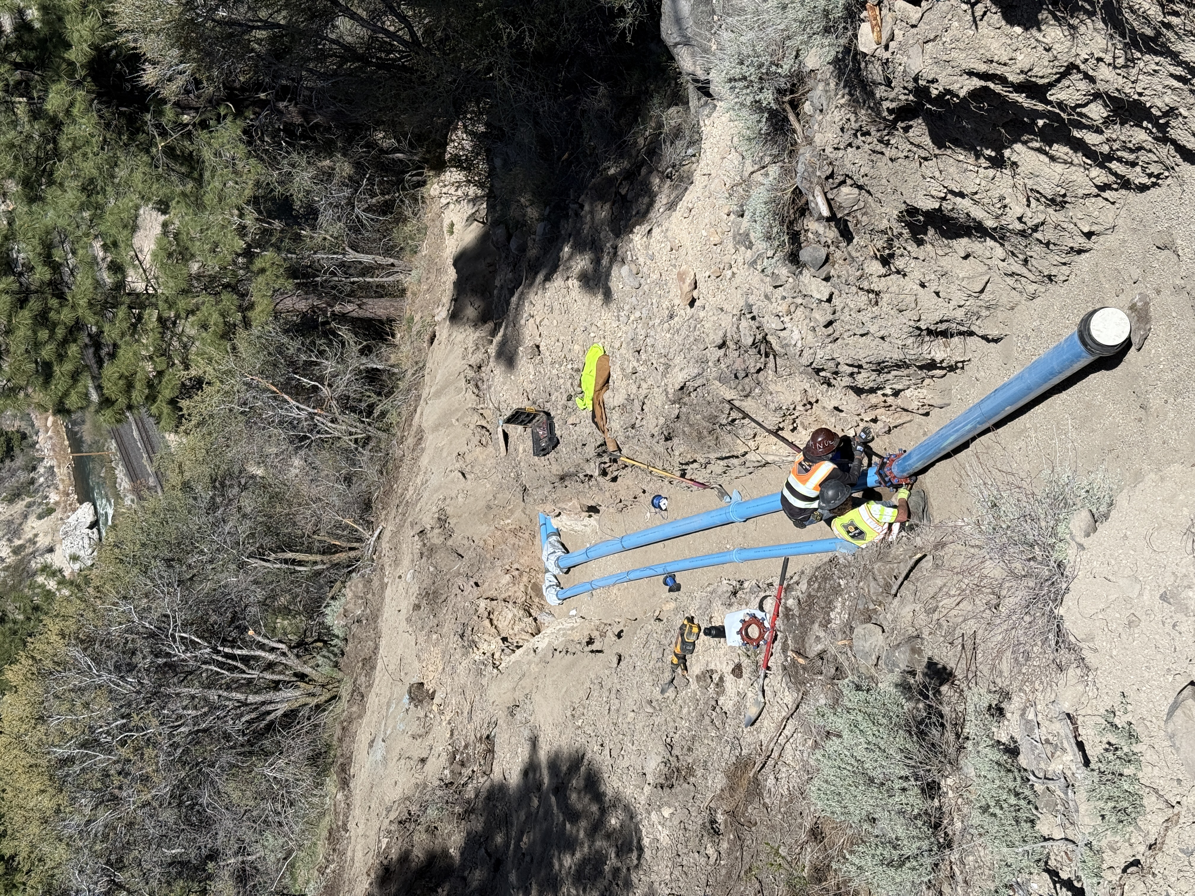 The image depicts workers installing pipelines within an open trench on a hillside. Two blue pipes are visible laid parallel in the trench, with workers using tools to secure them. The area around the trench is rugged, with visible trees and a river in the background. The workers are wearing safety equipment, including hard hats, high-visibility vests, and work boots.
