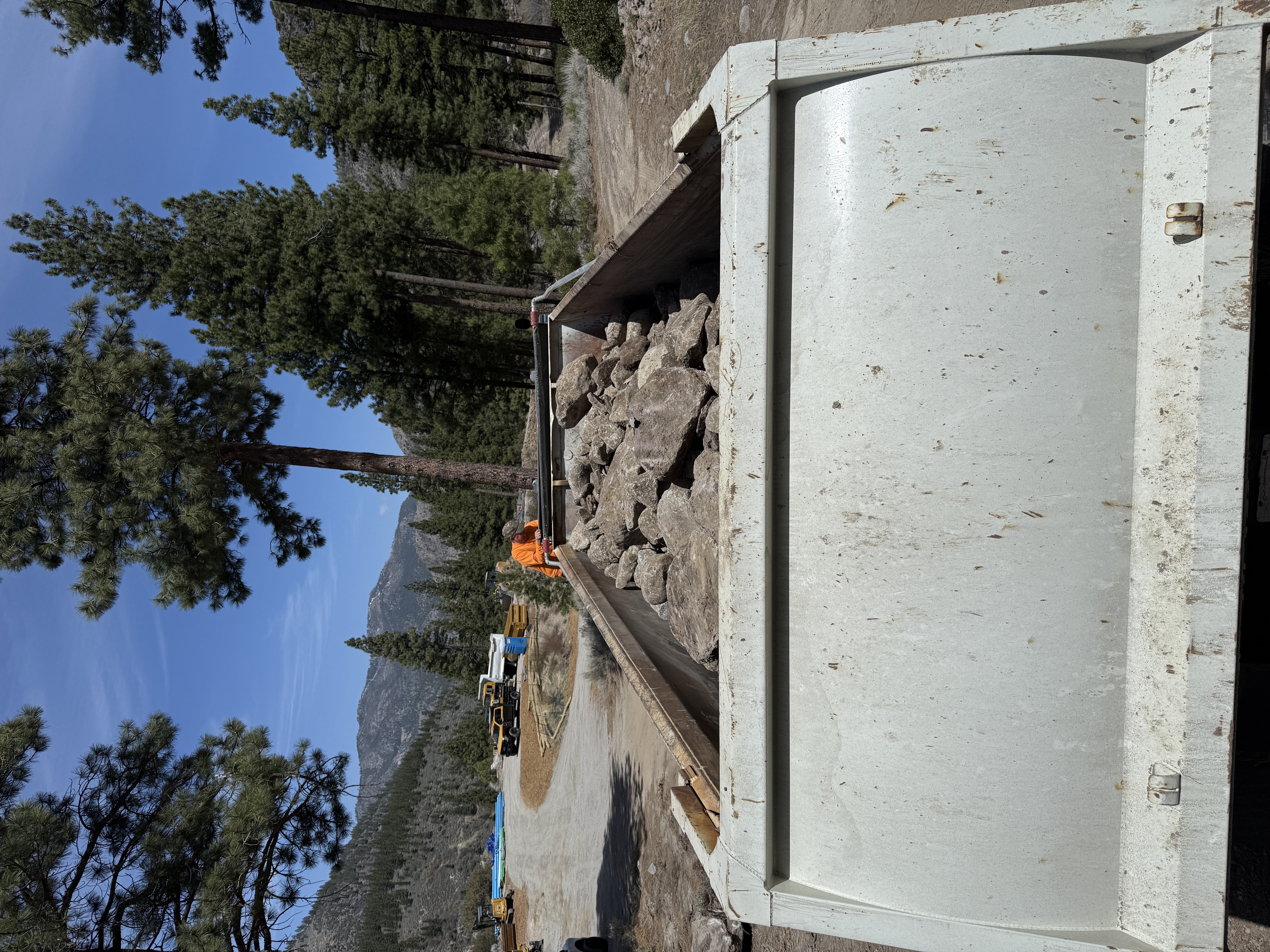 The image shows a dump truck loaded with rocks parked on a dirt road surrounded by pine trees. A person in an orange high-visibility shirt is seen near the truck, possibly working or observing. In the background, additional construction vehicles and equipment are visible, indicating active construction work. The site is in a mountainous, forested area with clear, sunny weather.