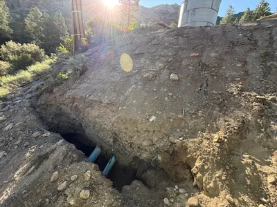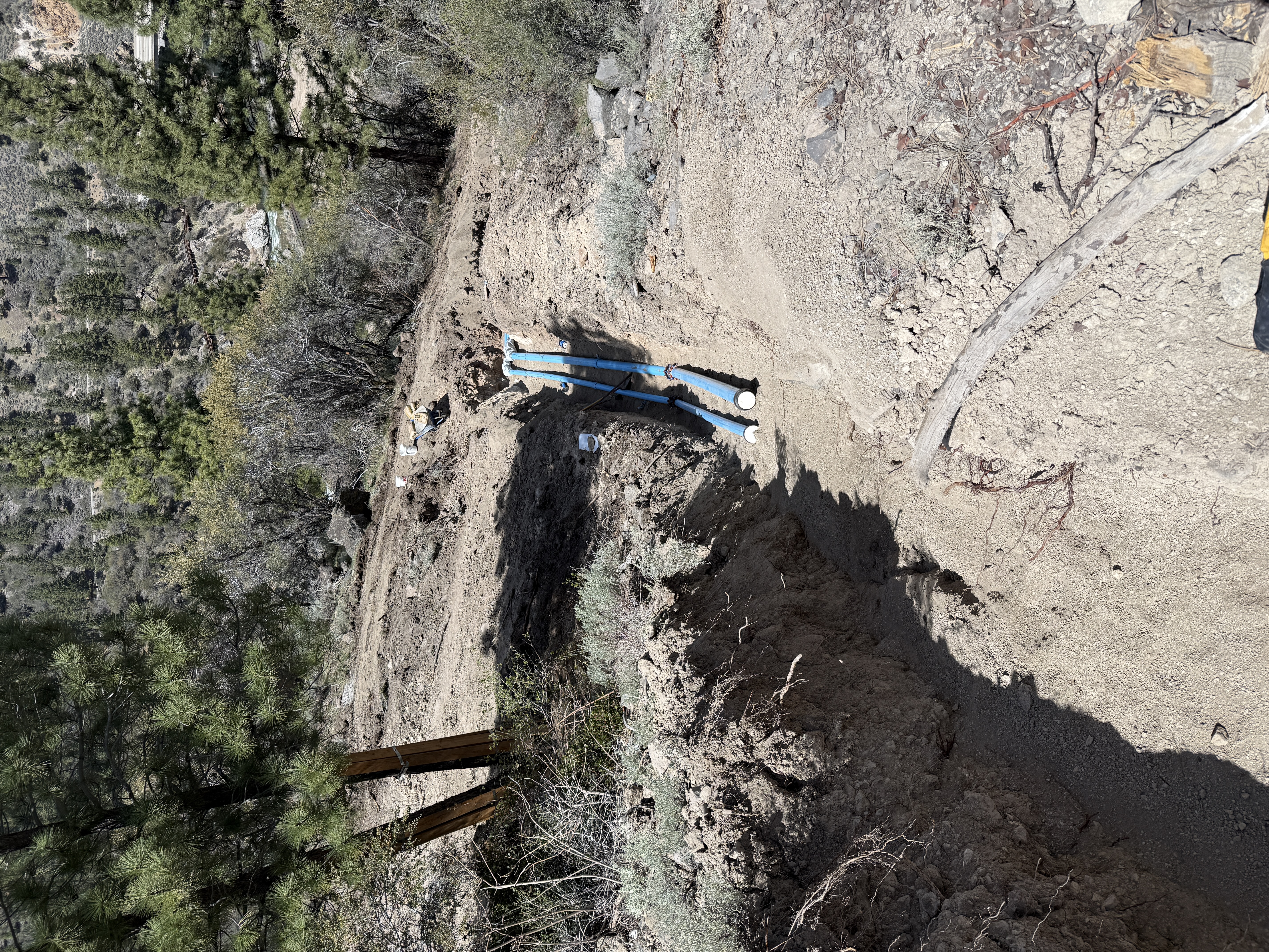 The image shows an excavated trench with two blue pipes laid within it. The trench is visible running down a slope surrounded by dirt and sparse vegetation. There are no construction workers visible, and the trench appears open. Some wooden supports are seen around trees, but no specific pipe connections or endpoints are discernible.