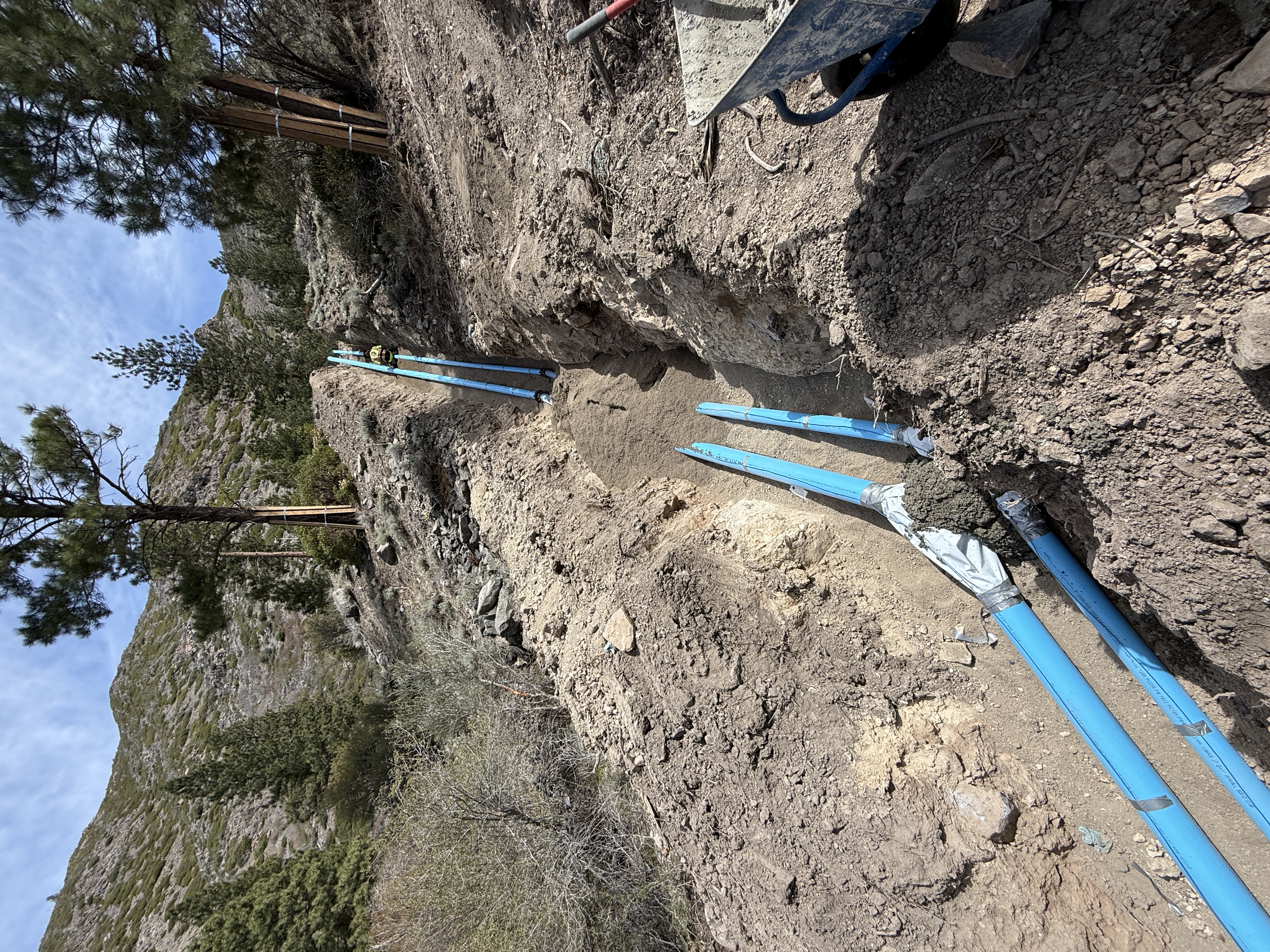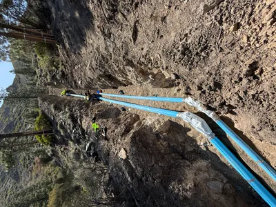 The image shows a trench dug into a hillside with blue pipes partially installed or staged within. The trench appears to be open with some earth fill around the pipes. The setting is a natural, rocky landscape with some vegetation, and no heavy equipment is visible in the immediate frame.