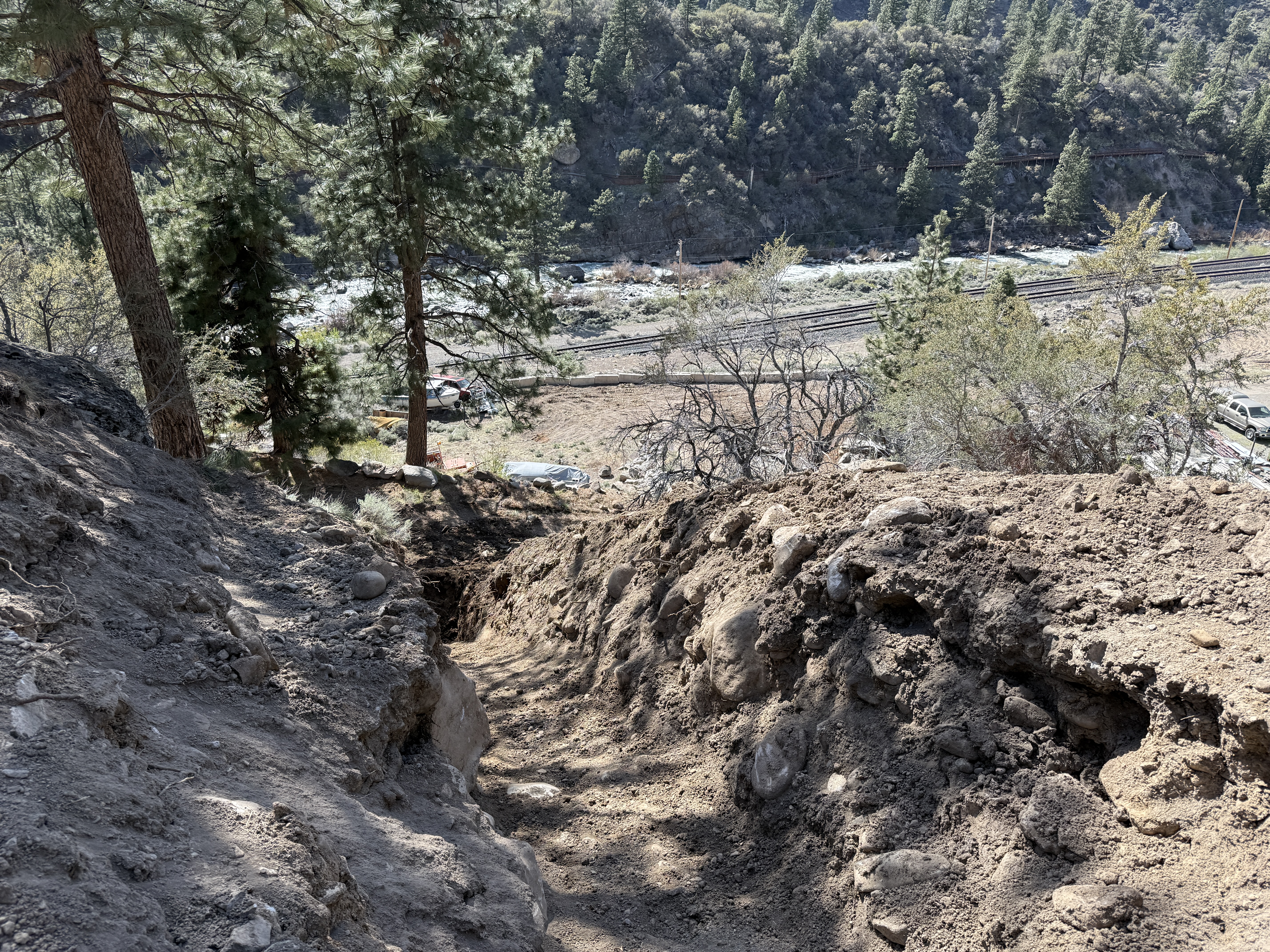 The image captures a trench running down a slope, with visible soil and rocks along the excavation. Trees are present to the left side of the trench. In the background, there are visible rail tracks and a few vehicles. This appears to be in a forested or rural setting.