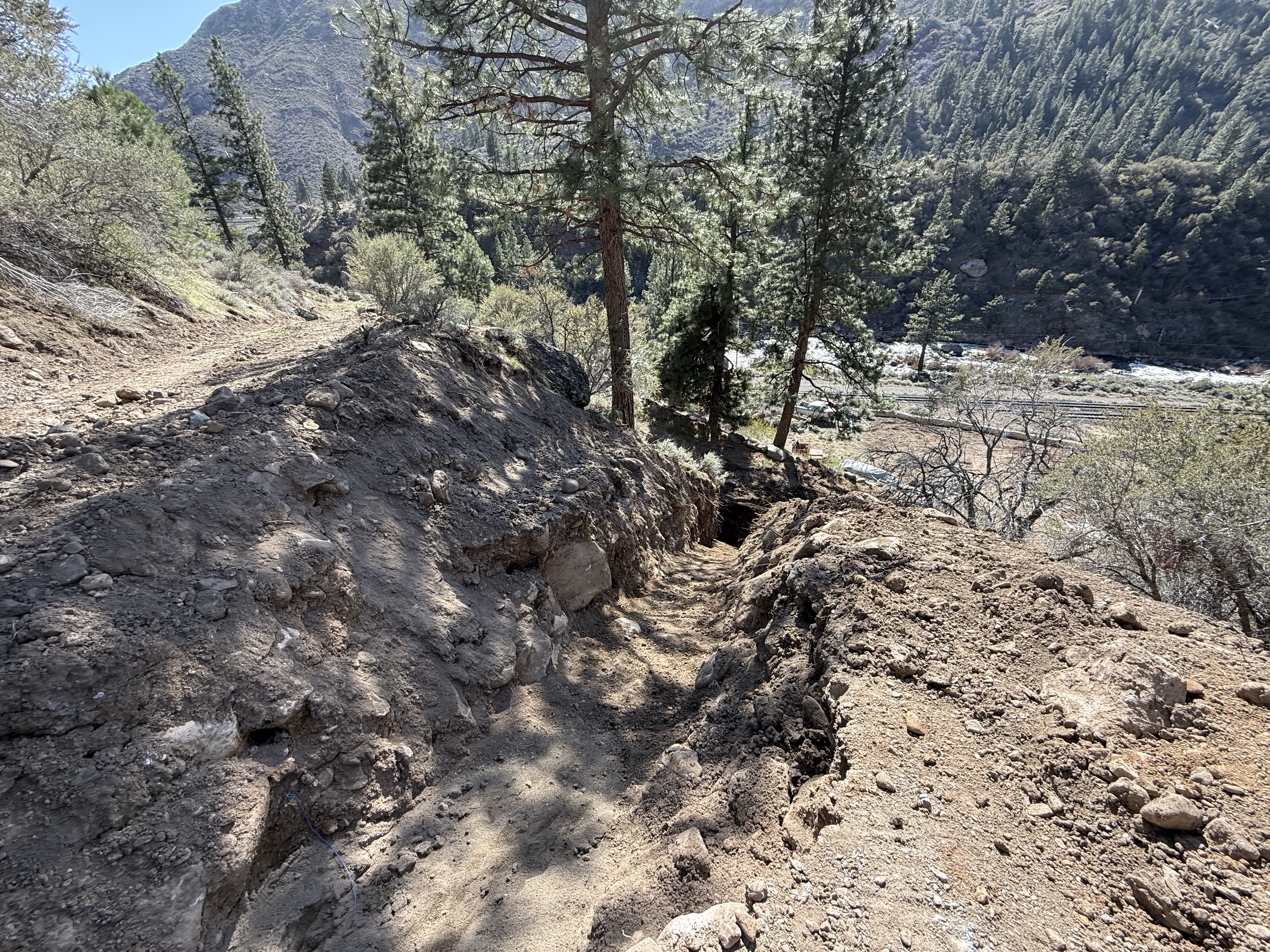 The image shows a trench along a sloped hillside. Loose earth and rocks are evident within and around the trench area. No construction equipment or workers are visible in the frame, and the trench appears to be leading towards a wooded area with a river or stream in the background.