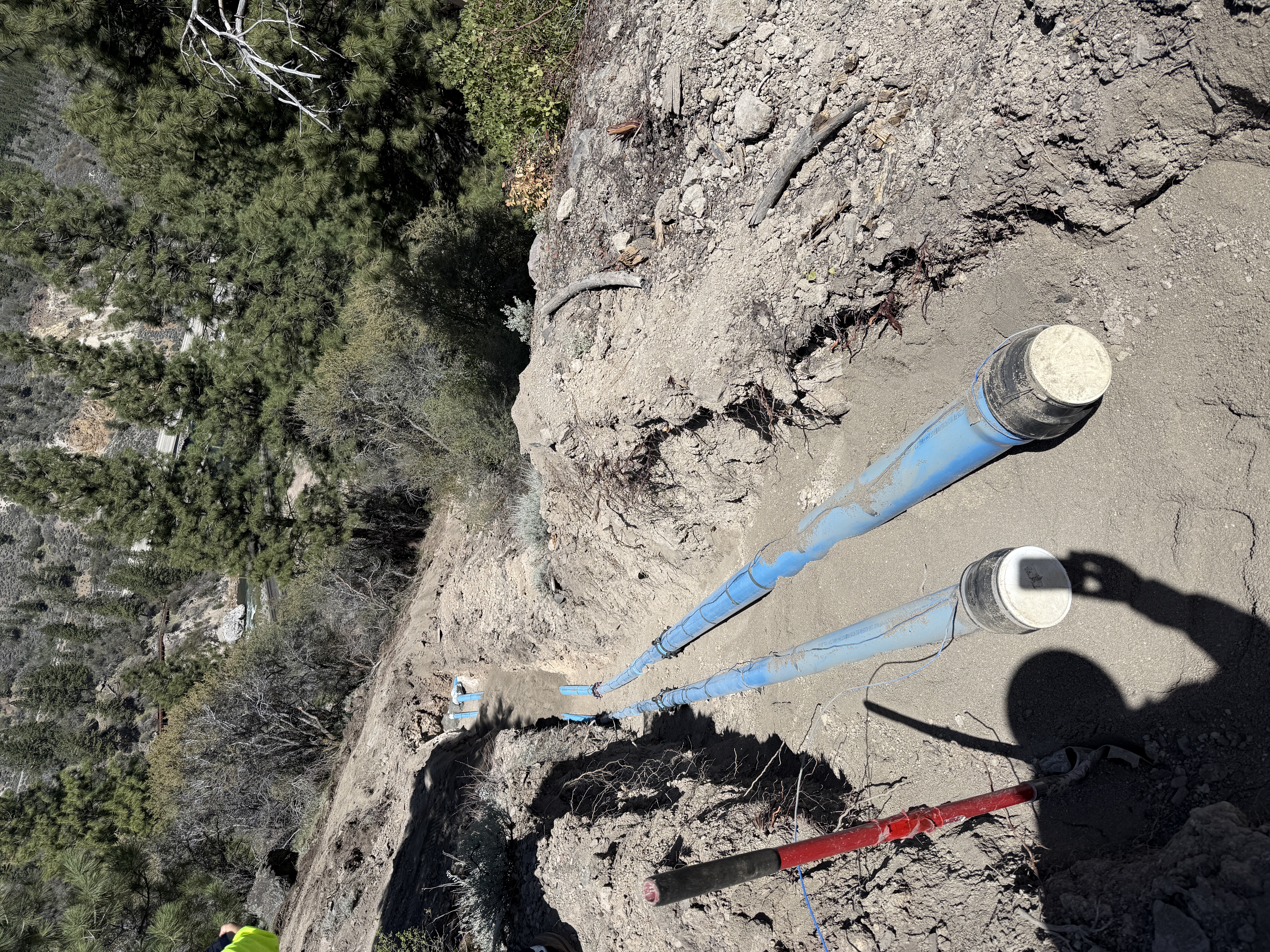 The image shows an open trench in a hilly, wooded area with two blue pipes running parallel inside the trench. The trench is sandy and sloped, with a shovel sticking partially out of the ground near the bottom of the frame. Vegetation and trees are visible on the surrounding slopes, suggesting the site is in a natural or semi-rural area. There is no heavy equipment visible, and the trench appears to be manually dug.