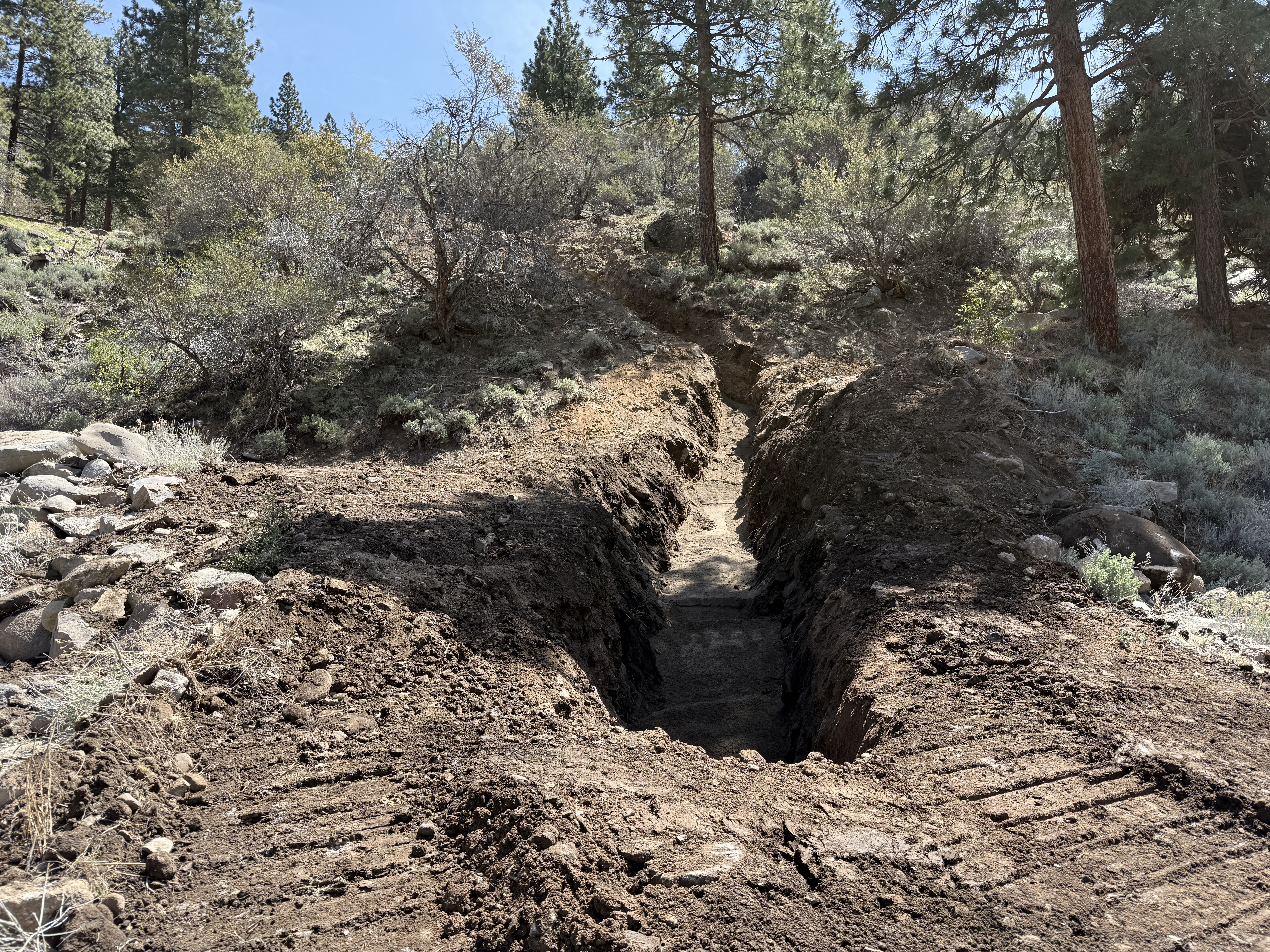The image shows a trench dug into a hillside surrounded by trees and brush. The trench appears to be straight and of consistent width, suggesting recent excavation work. The area is a natural landscape with dirt and minimal visible construction materials. No machinery or safety equipment is visible.
