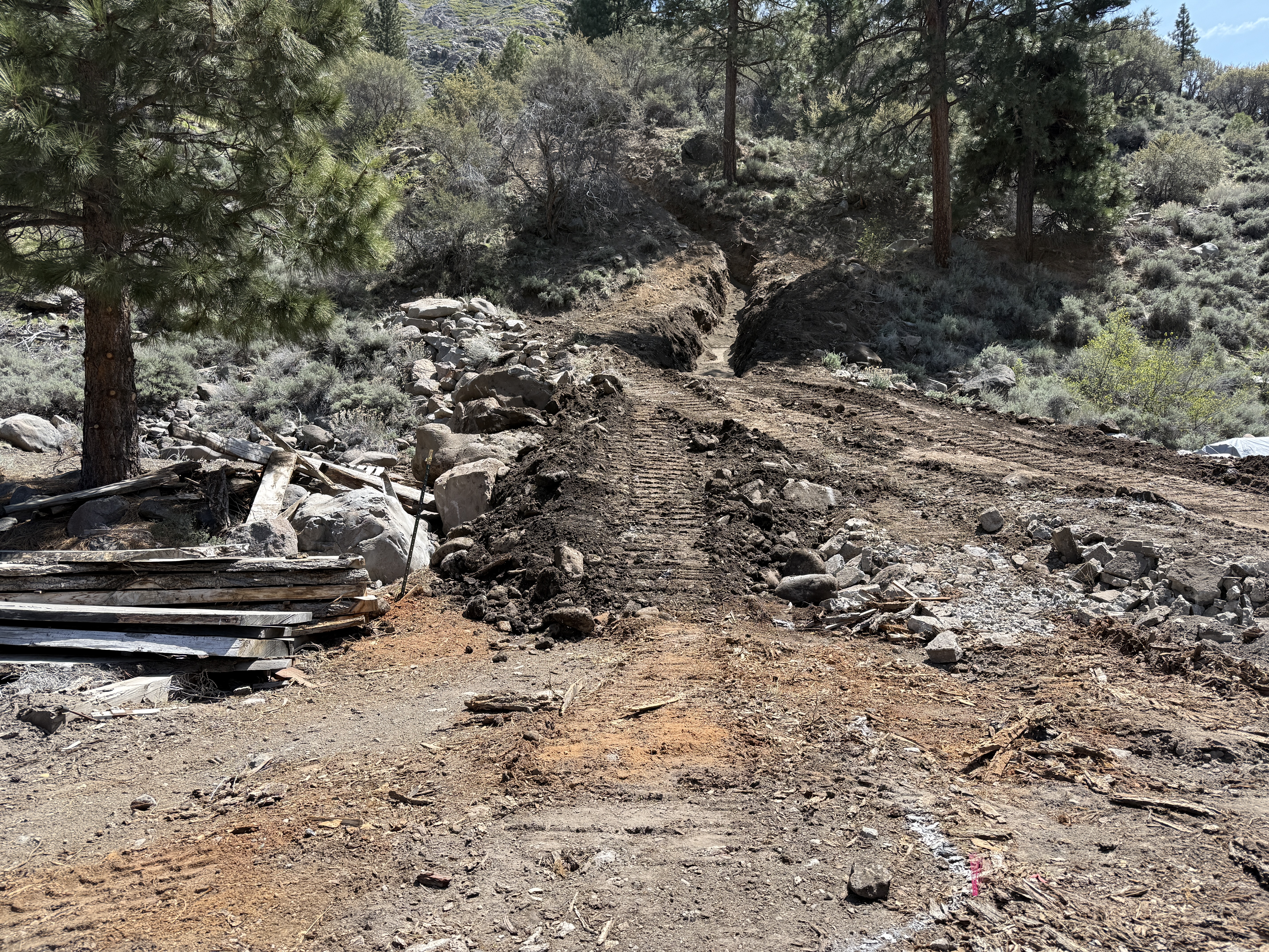 dirt and rocky with a trench daylight, dry conditions relatively clear with some debris at access points
