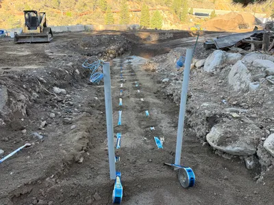 The image shows a person in a trench on a sloped, dirt-covered worksite. They appear to be working on the installation of a white pipe. The trench is surrounded by dry soil and low vegetation, typical of undeveloped areas. The person is wearing a hi-vis vest, and there are tools visible in the trench.