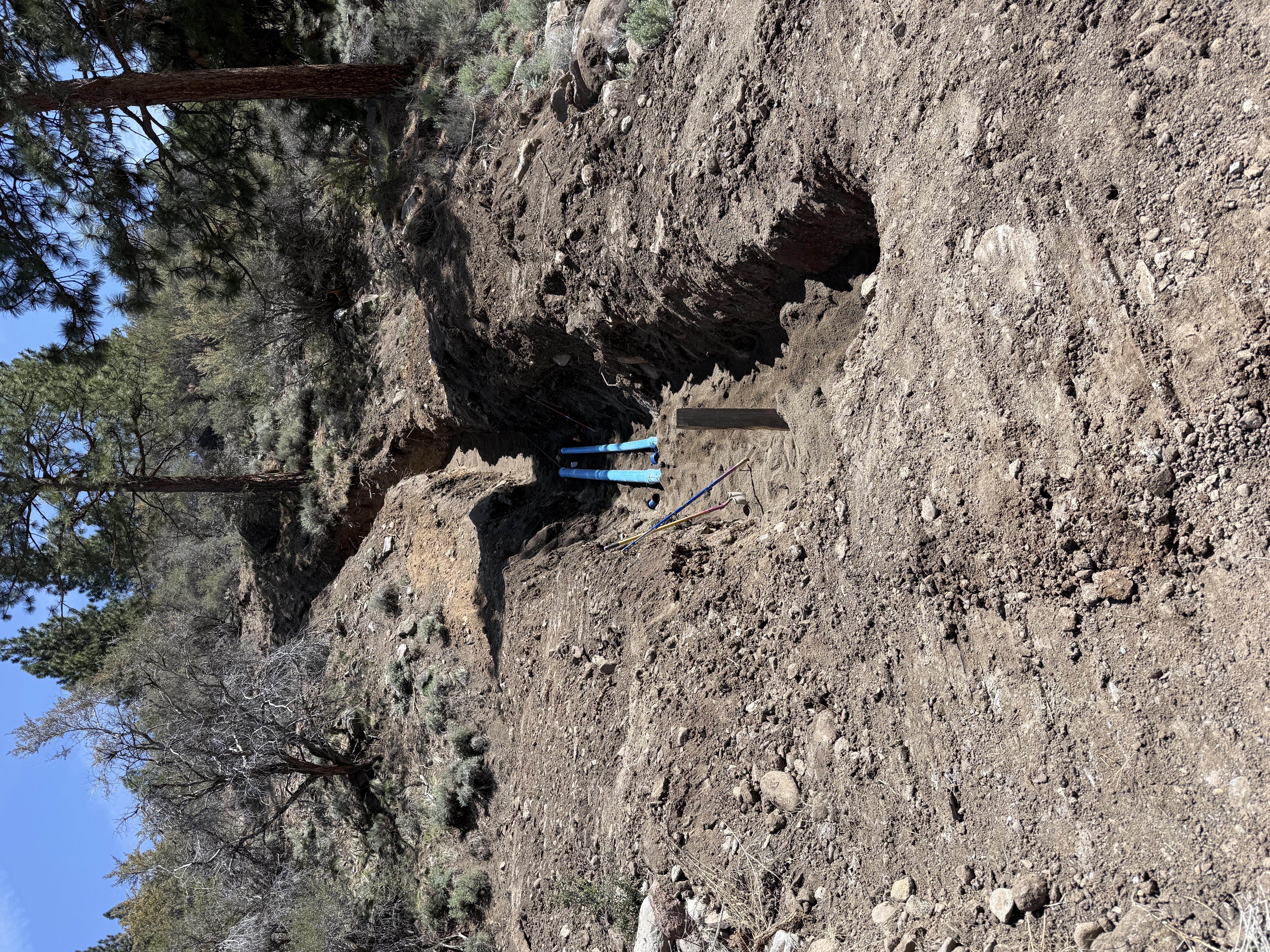 dirt and rock trench, sloped terrain clear skies, adequate daylight limited access due to slope